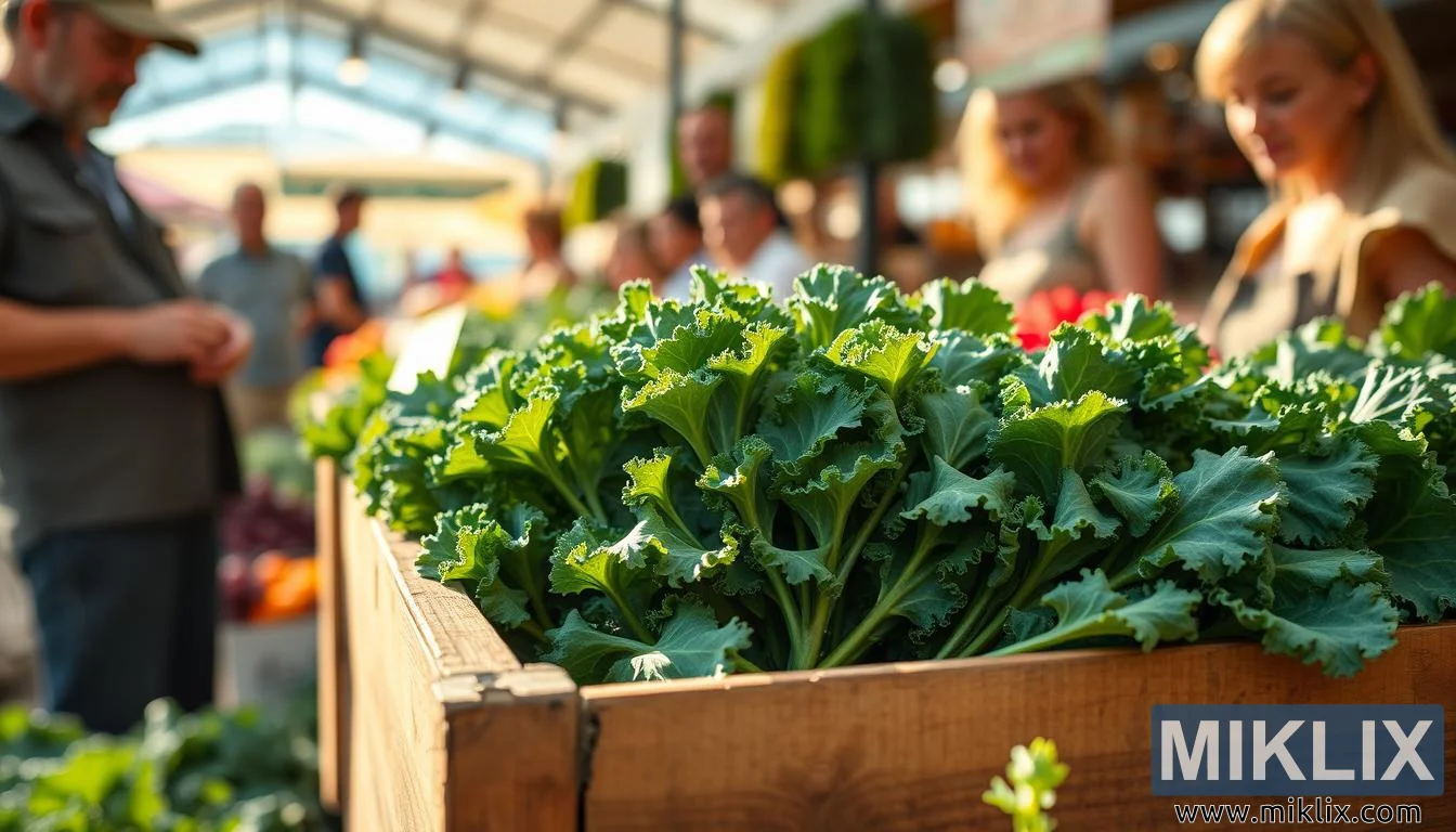 Sa kabuuan, ang larawang ito ay higit pa sa isang paglalarawan ng sariwang ani—ito ay isang imbitasyon na yakapin ang isang pamumuhay na batay sa pagiging bago, koneksyon, at kagalingan. Ang masalimuot na texture at matingkad na kulay ng kale, na ipinares sa simpleng crate at ang init ng tao sa palengke, ay pumukaw ng pakiramdam ng kasaganaan na kasing kultura at nutrisyon. Ito ay isang paalala na ang pagkain ay pinakamakapangyarihan kapag hindi ito nagmumula sa malayo, pang-industriyang pinagmumulan, ngunit mula sa mga lokal na kamay at matabang lupa, na nagdadala nito hindi lamang ng mga sustansya kundi pati na rin ang mga kuwento, pamana, at diwa ng komunidad.