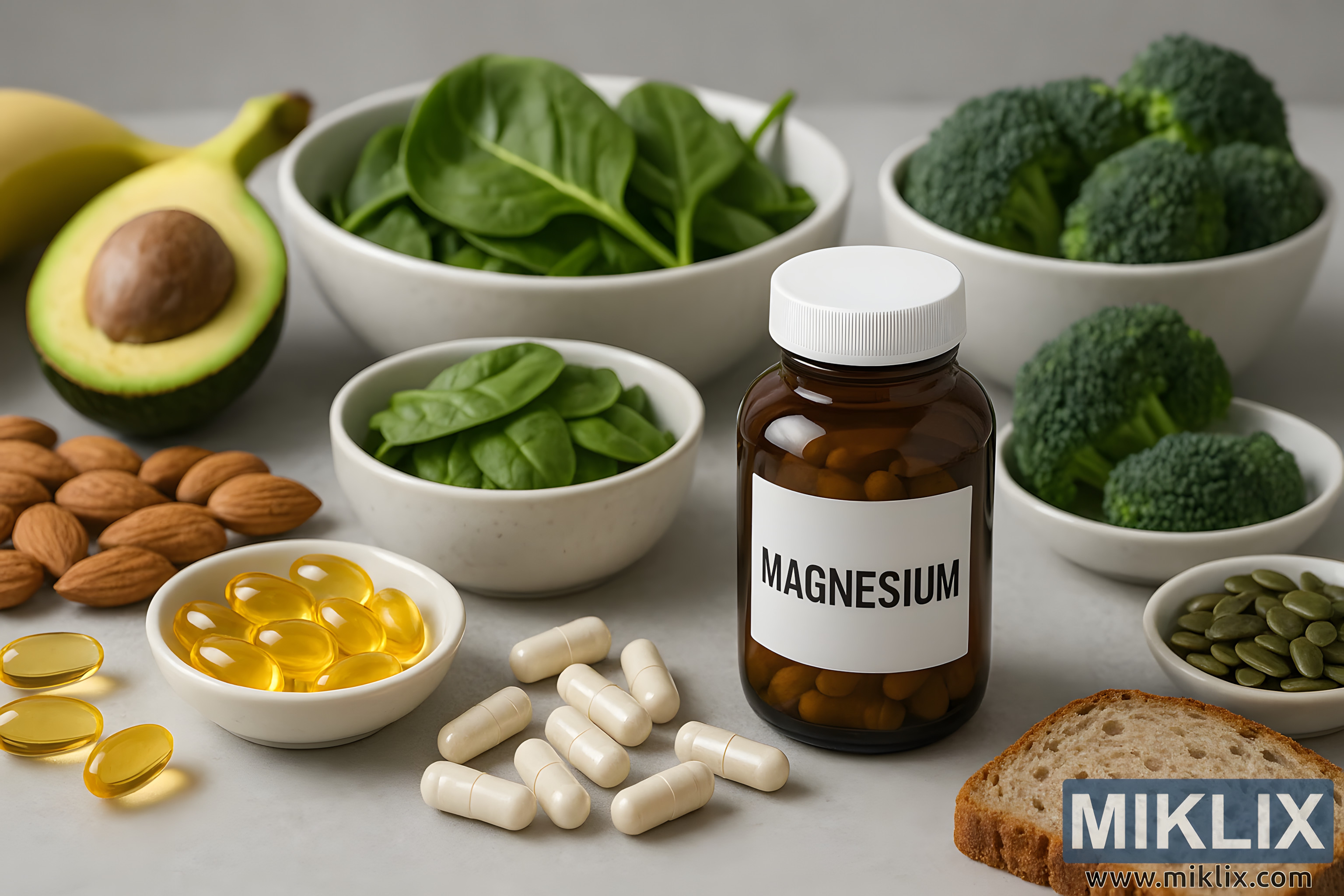 Amber na bote ng magnesium na may mga kapsula at softgel na napapalibutan ng spinach, avocado, nuts, buto, saging, at tinapay, na nagbibigay-diin sa mga natural na mapagkukunan ng sustansya.