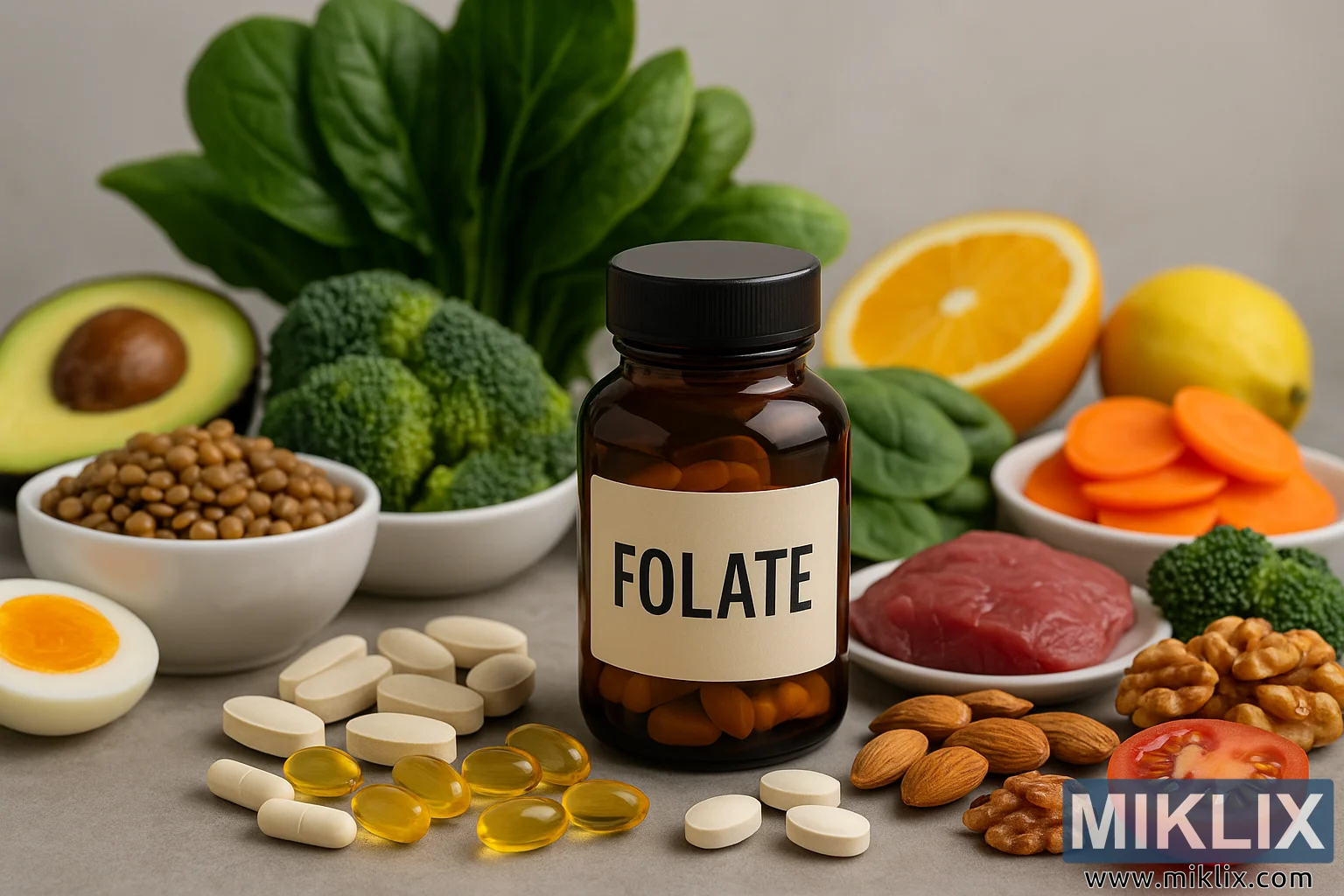 Amber folate supplement bottle na may mga tablet at kapsula na napapalibutan ng spinach, broccoli, avocado, lentils, citrus, itlog, mani, at karne, na sumusuporta sa kalusugan ng cell.