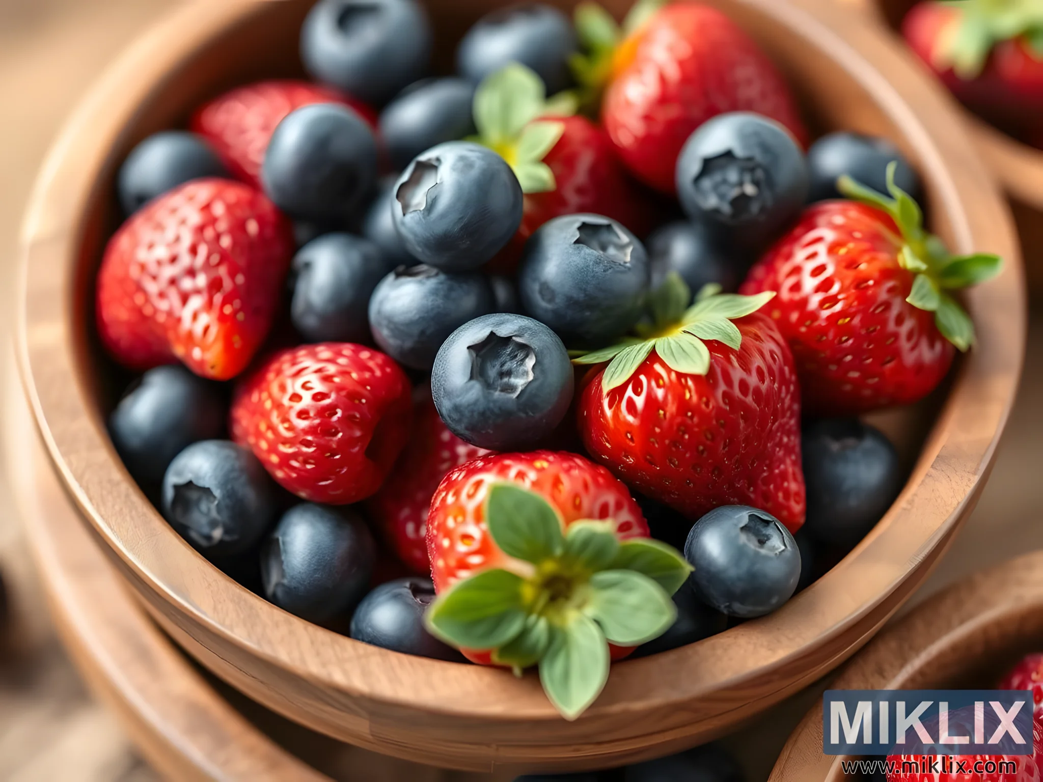 Matatagpuan sa loob ng mainit na yakap ng isang handcrafted na mangkok na gawa sa kahoy, ang isang makulay na halo ng mga sariwang strawberry at blueberry ay lumilikha ng isang kasiyahan para sa mga mata at isang pangako ng lasa. Ang mangkok mismo, na may makinis na butil at makalupang mga tono, ay nagdudulot ng pakiramdam ng simpleng pagiging simple—isang pagpupugay sa kalikasan at tradisyon. Ito ang uri ng sasakyang-dagat na inaasahan mong mahahanap sa isang naliliwanagan ng araw na mesa ng farmhouse o sa gitna ng isang piknik sa tag-araw, na puno ng pinakamagagandang handog sa panahon. Ang mga prutas sa loob ay inayos nang walang hirap, ang kanilang mga kulay at texture ay nagkakasundo sa paraang kusang-loob at sinasadya.