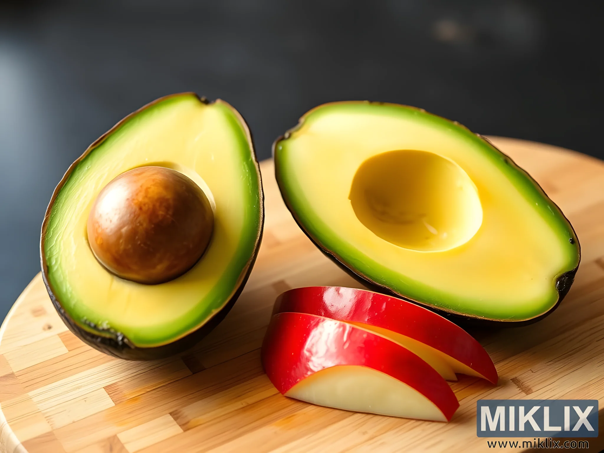 Isang hinog na kalahating abukado na may creamy green na laman at isang brown pit ay nakaupo sa tabi ng sariwang pulang hiwa ng mansanas sa isang kahoy na cutting board na may simpleng detalye.