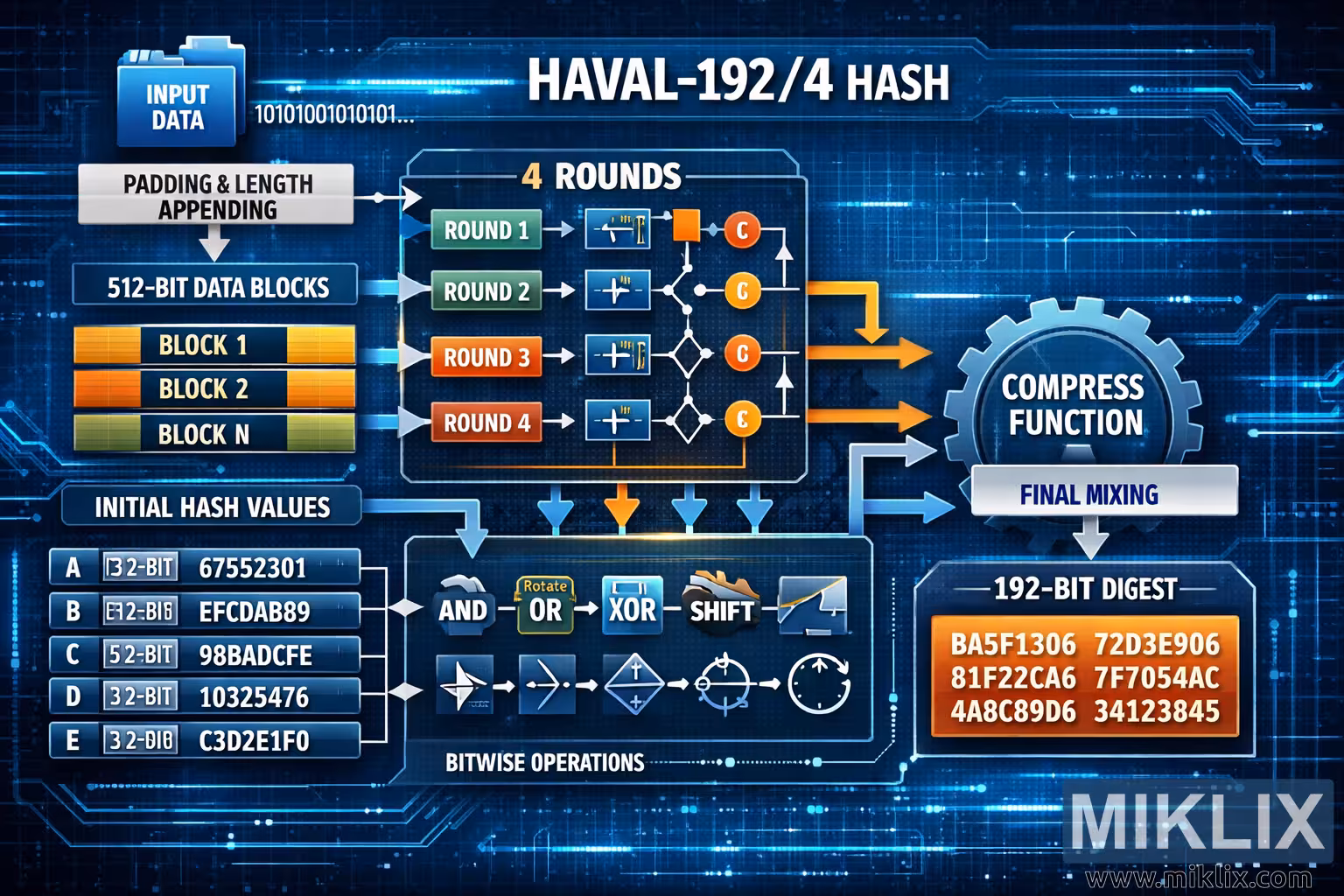 Ang pangkalahatang disenyo ay nagtatampok ng asul, parang-sirkito na background na may malabong elektronikong bakas at mga pattern ng grid, na nagpapaalala sa isang high-tech na digital na kapaligiran. Ang tipograpiya ay matapang at moderno, na naaayon sa teknikal na dokumentasyon at mga infographic ng cybersecurity. Ang visual na daloy, contrast ng kulay, at mga mekanikal na elemento na magkasama ay lumilikha ng isang malinaw ngunit kumplikadong representasyon ng proseso ng hashing ng HAVAL-192/4, na naglalarawan kung paano ang input data ay unti-unting binabago sa isang fixed-length cryptographic digest sa pamamagitan ng nakabalangkas, multi-stage na pagkalkula.
