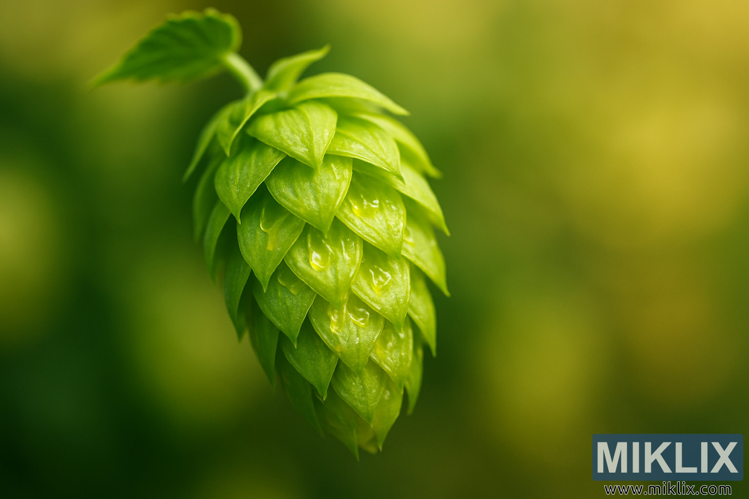 Mula sa isang compositional perspective, ang imahe ay balanse at dynamic. Ang hop cone ay nakaposisyon nang bahagya sa labas ng gitna, na sumusunod sa panuntunan ng ikatlo, na ang dulo nito ay nakaanggulo pababa at bahagyang patungo sa tumitingin. Ang diagonal na oryentasyong ito ay nagdaragdag ng paggalaw at three-dimensionality, na ginagawang halos parang buhay ang cone sa nasuspinde nitong estado. Ang isang maliit na bahagi ng stem at isang dahon ay umaabot mula sa kaliwang sulok sa itaas papunta sa frame, na nagbibigay ng konteksto sa natural na pagkakadikit ng hop habang nagdaragdag ng visual na interes at isang pakiramdam ng pinagmulan.