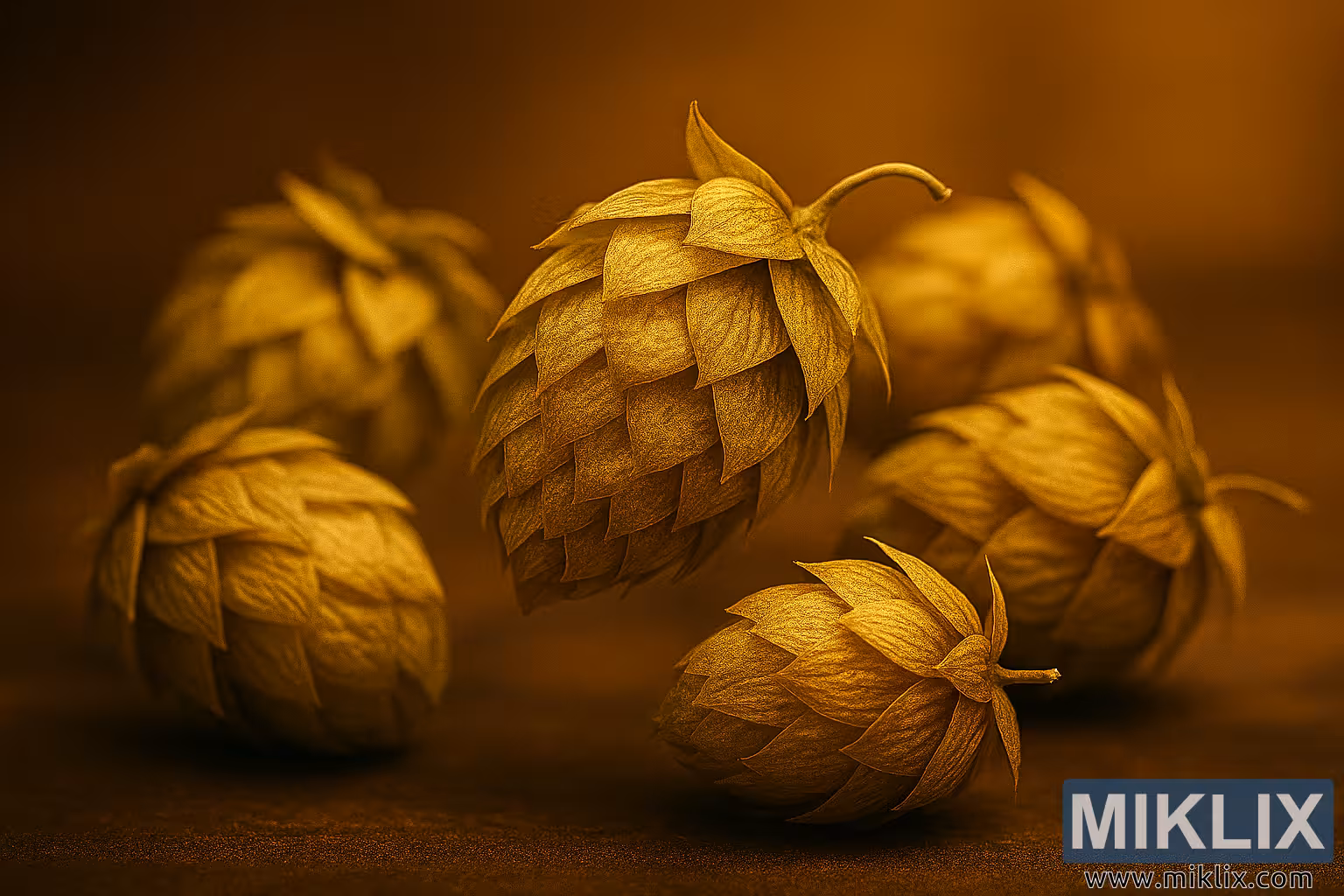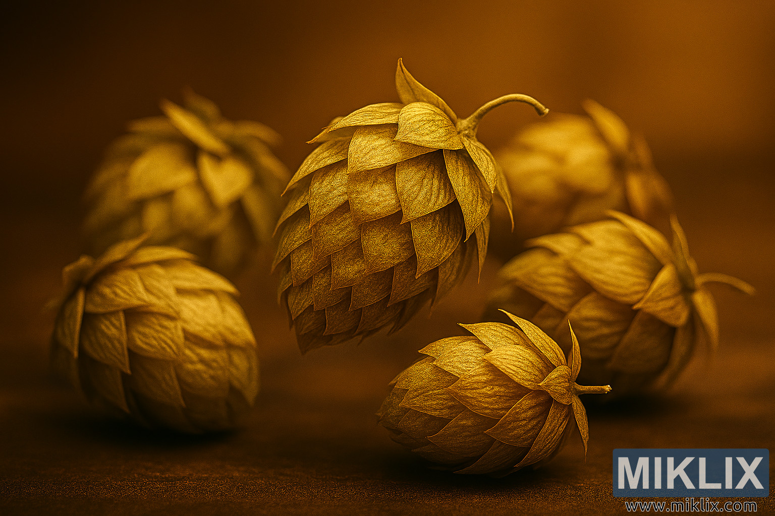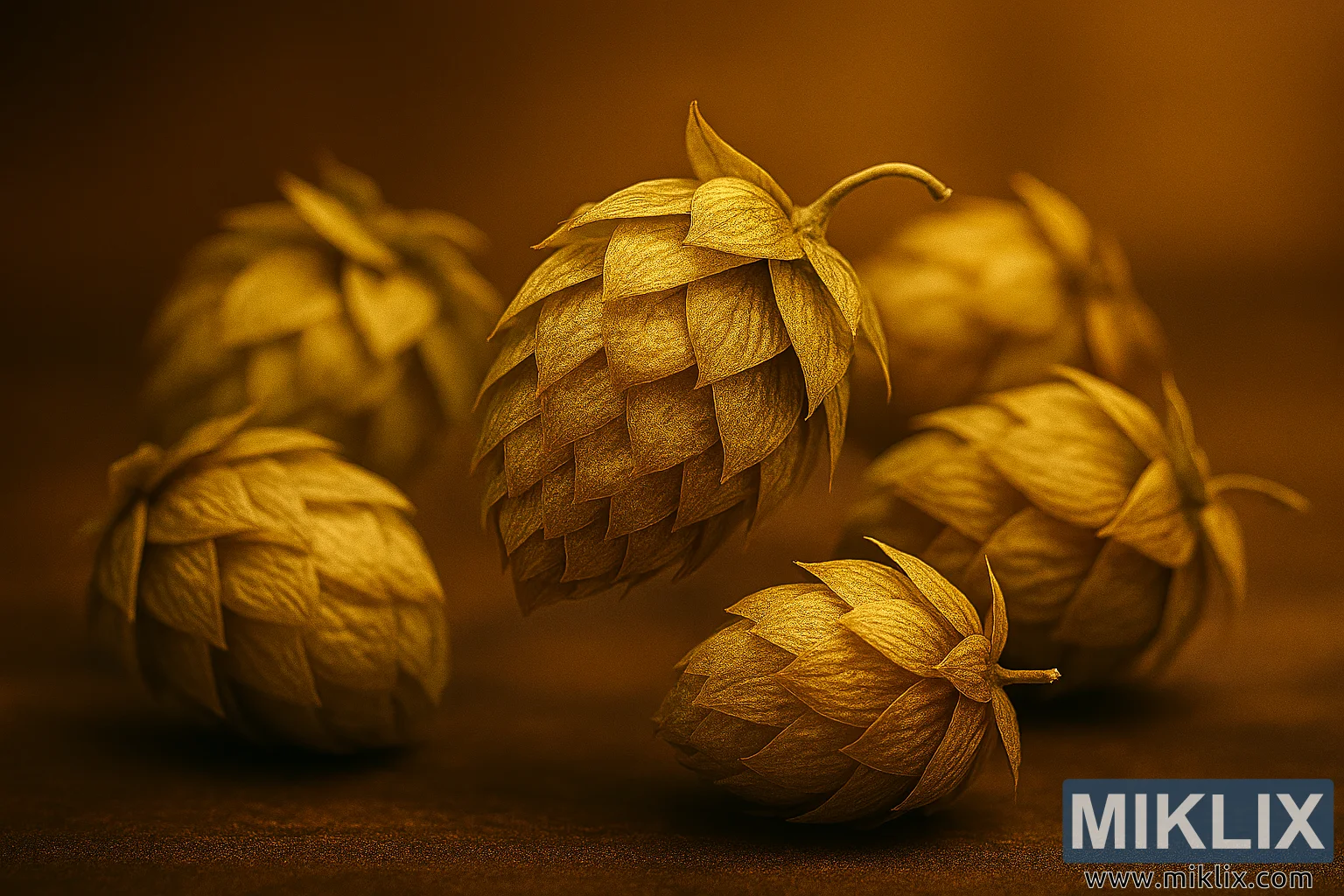 Ang background ay mahinang malabo, na binubuo ng mainit, makalupang kayumanggi na mga kulay na maganda ang kaibahan sa mga gintong-berdeng cone. Ang isang bokeh effect ay nagdaragdag ng visual na interes nang hindi nakakagambala mula sa foreground, na nagpapatibay sa artisanal na mood ng komposisyon. Nakadirekta ang pag-iilaw, na nagmumula sa kaliwang itaas, na nagbibigay ng ginintuang glow sa mga cone at lumilikha ng banayad na mga anino na nagdaragdag ng lalim at pagkakayari.