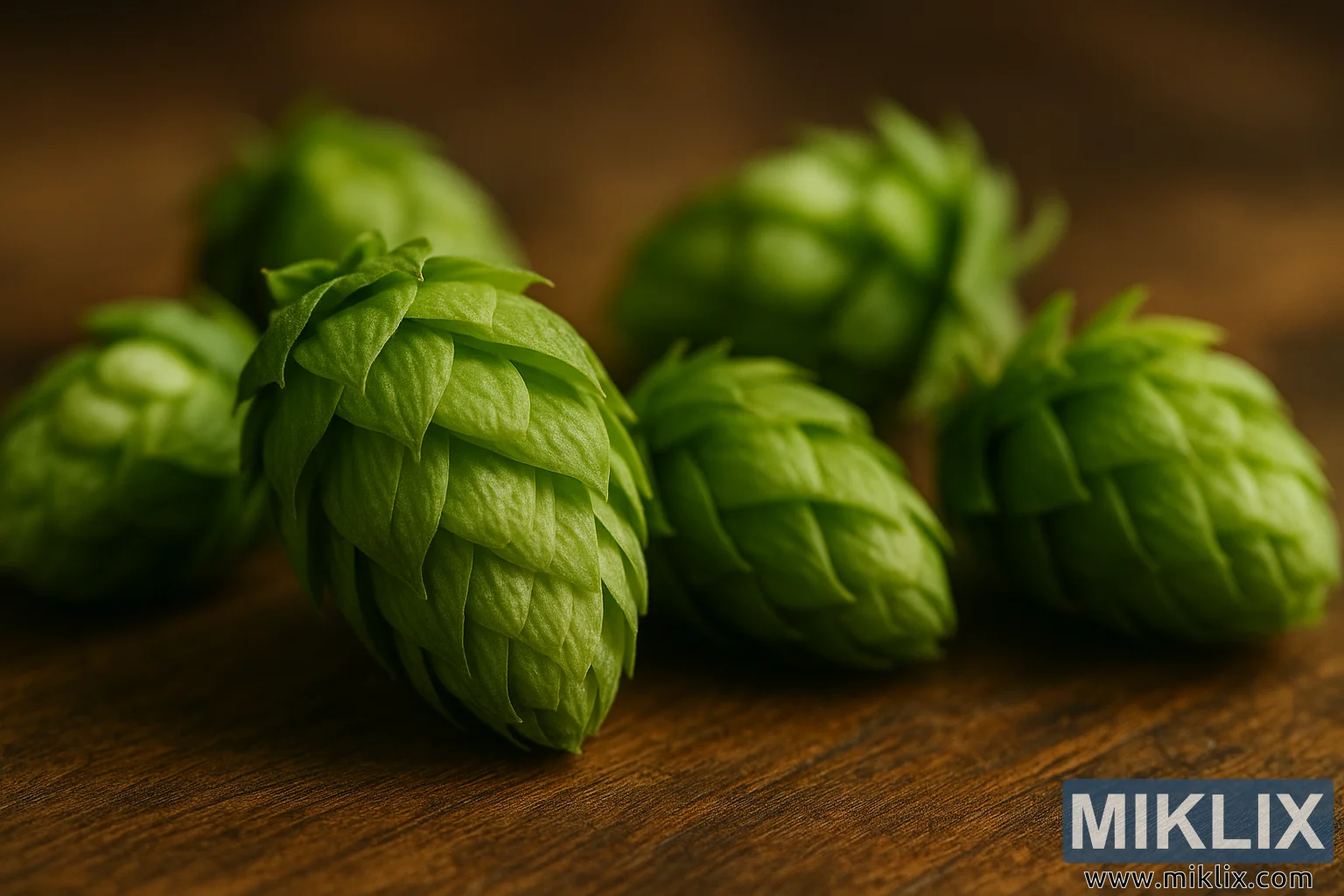 Close-Up of Freshly Harvested Vanguard Hop Cones on Wood