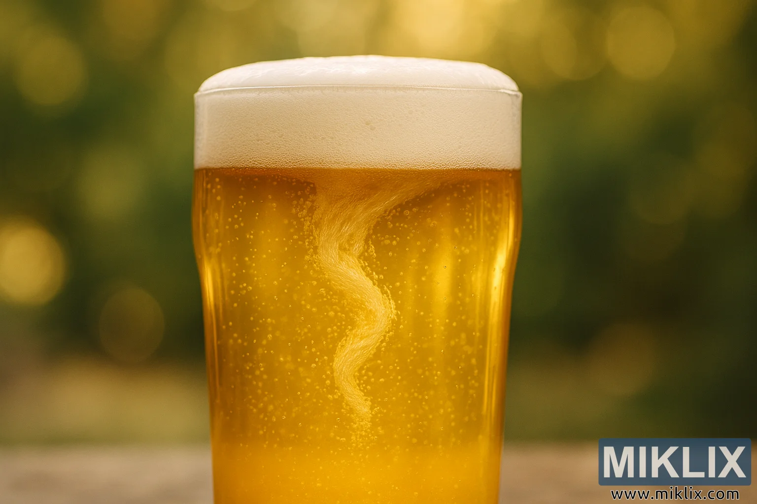Ang komposisyon ay minimalist ngunit malalim ang pagpapahayag. Ang litrato ay naka-frame upang ang salamin ay nangingibabaw sa eksena, nakatayo nang tuwid sa tila kahoy na ibabaw, posibleng nasa labas. Ang malabong background, na ginawa sa malambot na bokeh ng mga gulay at ginto, ay nagdudulot ng tahimik na natural na setting—isang hardin, isang gilid ng kagubatan, o marahil isang patio na nababanaag ng araw sa hapon. Ang banayad na mga bilog na bokeh ay umaalingawngaw sa mga effervescent bubble sa inumin, na nakikitang pinagsasama ang harapan at background. Ang malabong backdrop na ito ay hindi lamang nagbibigay ng visual depth ngunit nagsisilbi rin bilang simbolikong paalala ng mga organikong pinagmulan ng inumin—mga butil, lebadura, tubig, at sikat ng araw na nagbago sa pamamagitan ng oras at pagbuburo.