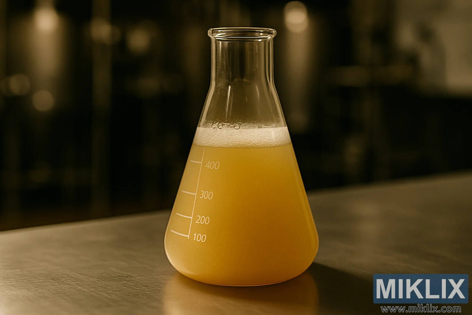 Ang litrato ay nag-aalok ng isang kapansin-pansing still-life na komposisyon ng isang Erlenmeyer flask, ang korteng kono nito ay agad na nakikilala bilang isang staple ng mga siyentipikong laboratoryo at mga kapaligiran sa pagsasaliksik ng paggawa ng serbesa. Ang prasko, na ginawa mula sa malinaw na borosilicate glass, ay matatag na nakapatong sa isang makintab na hindi kinakalawang na ibabaw na asero, na sumasalamin sa mainit na liwanag mula sa itaas. Ang mga dingding nito ay minarkahan ng puting gradweyd na mga linya ng pagsukat, na ang likido sa loob ay tumataas na lampas lamang sa 400-milliliter na marka.