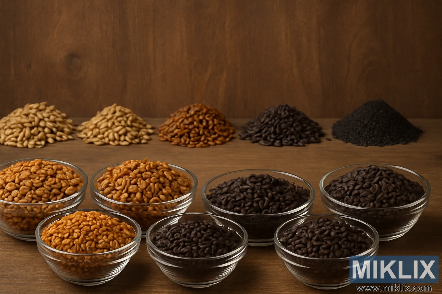 Sa isang napakagandang komposisyon na still life na tumutulay sa mga mundo ng paggawa ng agham at visual artistry, ang imahe ay nagpapakita ng isang mayaman at iba't ibang seleksyon ng mga alternatibong malt, bawat isa ay isang testamento sa lalim at pagkakaiba-iba ng lasa na dinadala ng mga espesyal na butil sa beer. Ang pagkakaayos ay sinadya at eleganteng, na may walong malinaw na mangkok na salamin na nakahanay sa harapan, bawat isa ay naglalaman ng natatanging uri ng malted barley. Ang mga butil ay may iba't ibang kulay mula sa maputlang karamelo hanggang sa malalim na kayumangging tsokolate, at maging sa kaharian ng halos itim, na nagmumungkahi ng isang spectrum ng mga antas ng litson at tindi ng lasa. Ang mga bowl mismo ay simple at transparent, na nagbibigay-daan sa manonood na ganap na tumutok sa mga butil sa loob—bawat kernel ay isang maliit na eskultura ng texture at kulay.