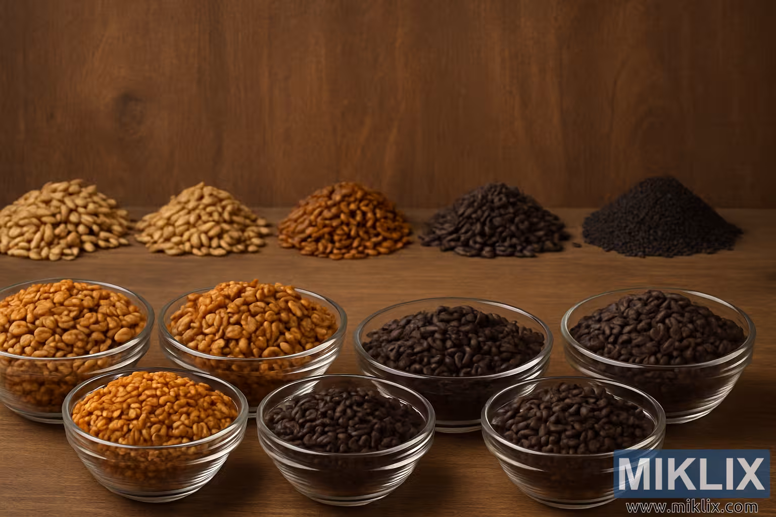 Ang kahoy na ibabaw at backdrop ay nagbibigay ng mainit at simpleng pundasyon para sa display. Ang butil ng kahoy ay nakikita ngunit maliit, ang natural na pagkakayari nito ay umaakma sa makalupang mga tono ng mga malt nang hindi nalulupig ang mga ito. Ang pag-iilaw ay malambot at pantay na ipinamahagi, na nagbibigay ng banayad na mga anino at nagpapahusay sa visual depth ng mga butil. Lumilikha ito ng mood na parehong mapagnilay-nilay at kaakit-akit, na parang ang manonood ay pumasok sa isang tahimik na sandali ng pagbuo ng recipe sa workspace ng master brewer. Ang interplay ng liwanag at anino sa kabuuan ng mga kernel ay nagpapakita ng kanilang mga indibidwal na hugis at mga detalye sa ibabaw—ang ilan ay makinis at bilugan, ang iba ay may tagaytay o bahagyang bitak—na binibigyang-diin ang pagiging natatangi ng bawat uri ng malt.