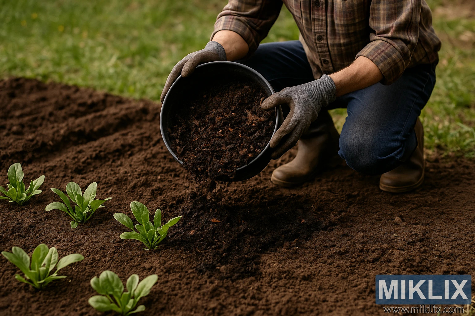 Sa detalyadong larawang ito ng landscape na may mataas na resolution, ipinapakita ang isang hardinero na naghahanda ng garden bed para sa pagtatanim ng spinach sa pamamagitan ng pagdaragdag ng compost at organikong bagay. Nakukuha ng komposisyon ang sandali ng pagkilos: ang tao, nakasuot ng brown na plaid shirt, maong na maong, rubber gardening boots, at proteksiyon na kulay abong guwantes, ay nakaluhod sa isang tuhod sa ibabaw ng bagong binubungkal na kama ng madilim at matabang lupa. Ang hardinero ay maingat na nagbubuhos ng isang balde ng mayaman, nabubulok na compost sa lupa, pinayaman ito bago itanim o alagaan ang mga umiiral na punla.