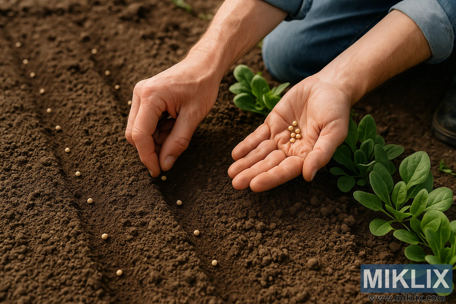 Hands Planting Spinach Seeds in Neat Garden Rows