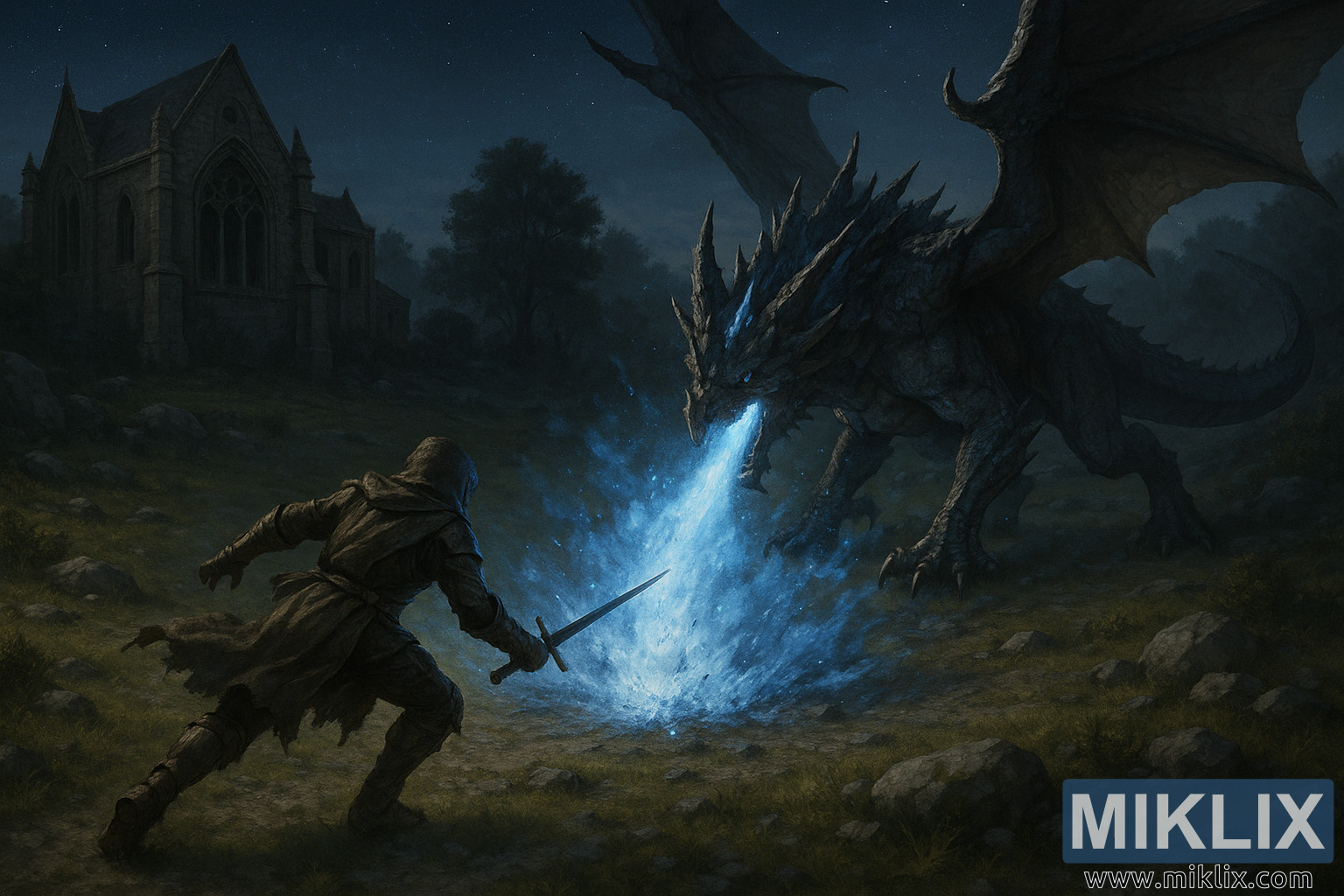 Ang ilustrasyong ito na may mataas na resolusyon at nakatuon sa tanawin ay naglalarawan ng isang matinding sandali ng aktibong labanan mula sa Elden Ring, na ipinakita sa isang makatotohanang istilo ng pantasya na may mas malinaw at mas madaling mabasang ilaw. Ang eksena ay nagaganap sa gabi sa ilalim ng isang malawak at puno ng mga bituin na kalangitan, ngunit hindi tulad ng isang napakadilim na paglalarawan, ang kapaligiran ay naliliwanagan ng isang balanseng kumbinasyon ng liwanag ng buwan, liwanag ng mga bituin, at ang makapangyarihang asul na liwanag ng mahika ng glintstone. Ang pinahusay na ilaw na ito ay nagpapakita ng lupain, galaw, at detalye habang pinapanatili ang nakakatakot na kapaligiran ng lugar.