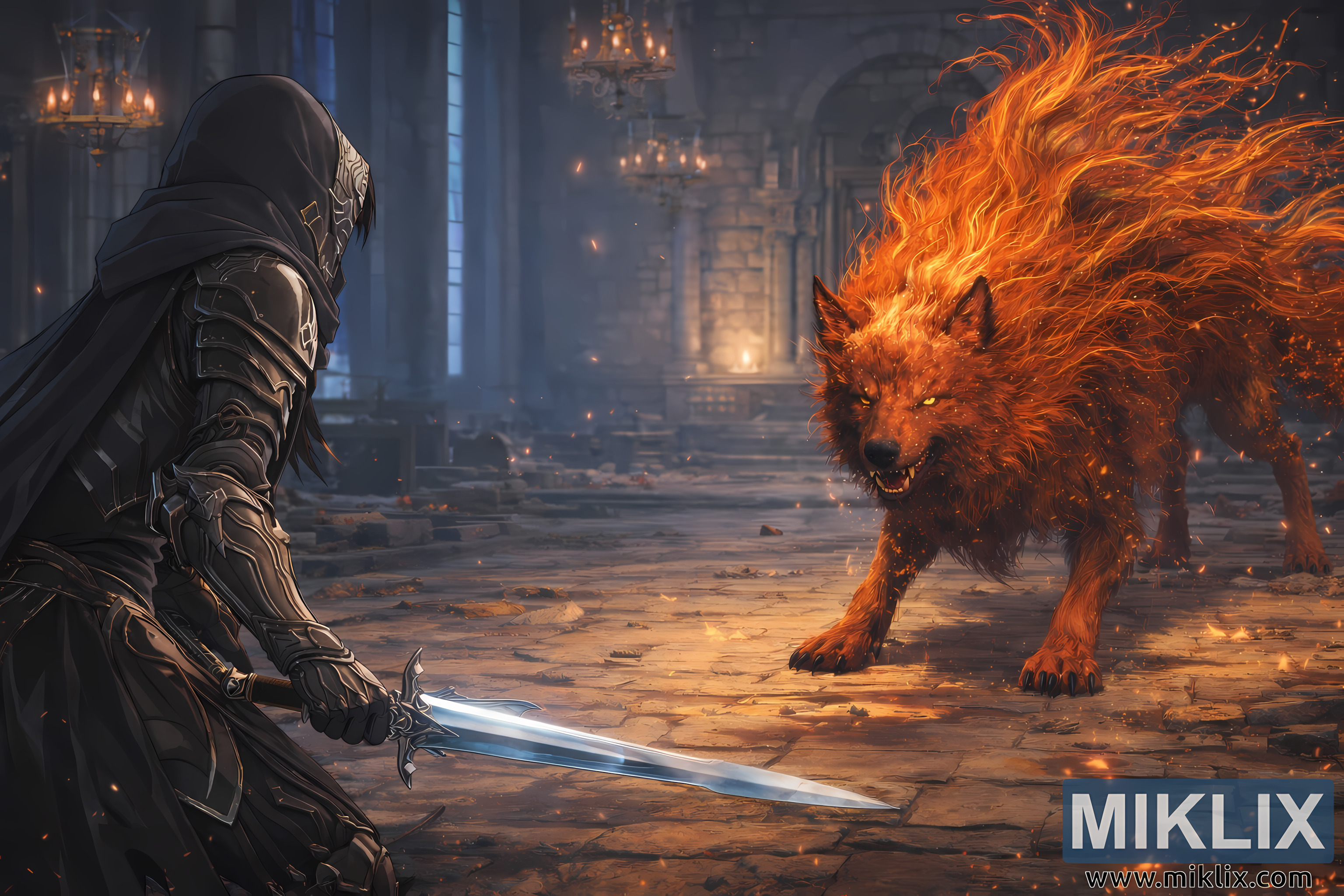 Maingat na binabalanse ng komposisyon ang parehong pigura sa pantay na distansya, na binibigyang-diin ang matinding katahimikan sa pagitan nila. Wala pang galaw na nakakasira sa alitan; sa halip, nakukuha ng imahe ang marupok na paghinto kung saan nagbabanggaan ang likas na ugali, takot, at determinasyon. Ang kaibahan sa pagitan ng anino at apoy, bakal at apoy, kalmadong disiplina at mabangis na kapangyarihan ang tumutukoy sa eksena. Sama-sama, binubuo ng mga elementong ito ang nagbabantang kagandahan, panganib, at pag-asam na nagpapakilala sa mundo ng Elden Ring, na nagpapalamig sa manonood sa eksaktong tibok ng puso bago sumiklab ang karahasan.