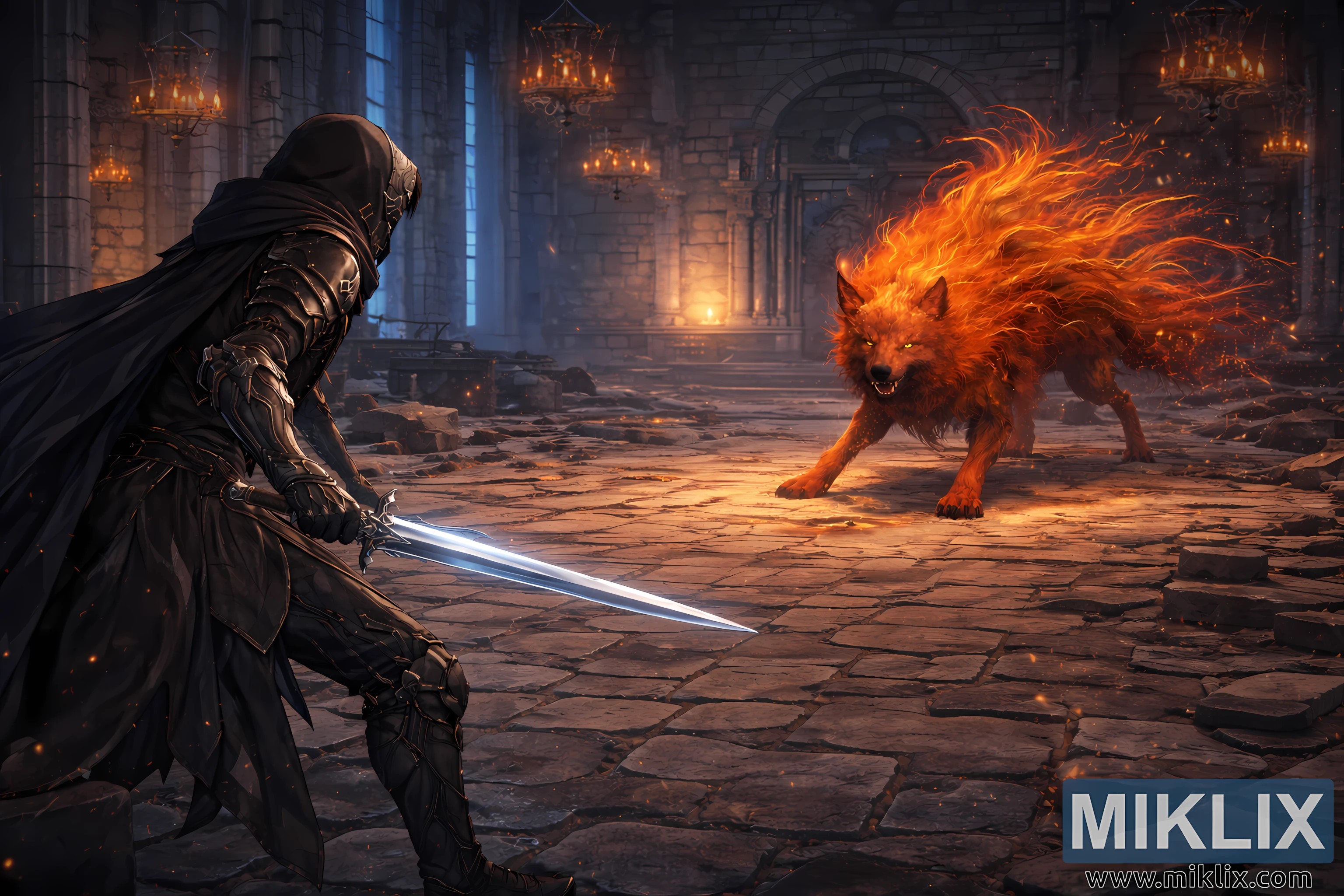 Binibigyang-diin ng pinalawak na komposisyon ang distansya sa pagitan ng dalawang pigura at ang matinding katahimikan na bumabalot dito. Wala pang nagsisimulang pag-atake; sa halip, nakukuha ng imahe ang nakabitin na tibok ng puso bago ang labanan, kung saan nagtatagpo ang takot, determinasyon, at likas na ugali. Ang kaibahan sa pagitan ng anino at apoy, bakal at apoy, kalmadong disiplina at mabangis na kapangyarihan ang tumutukoy sa eksena, na bumabalot sa nakababahalang kagandahan at nakamamatay na tensyon na nagpapakilala sa mundo ng Elden Ring.