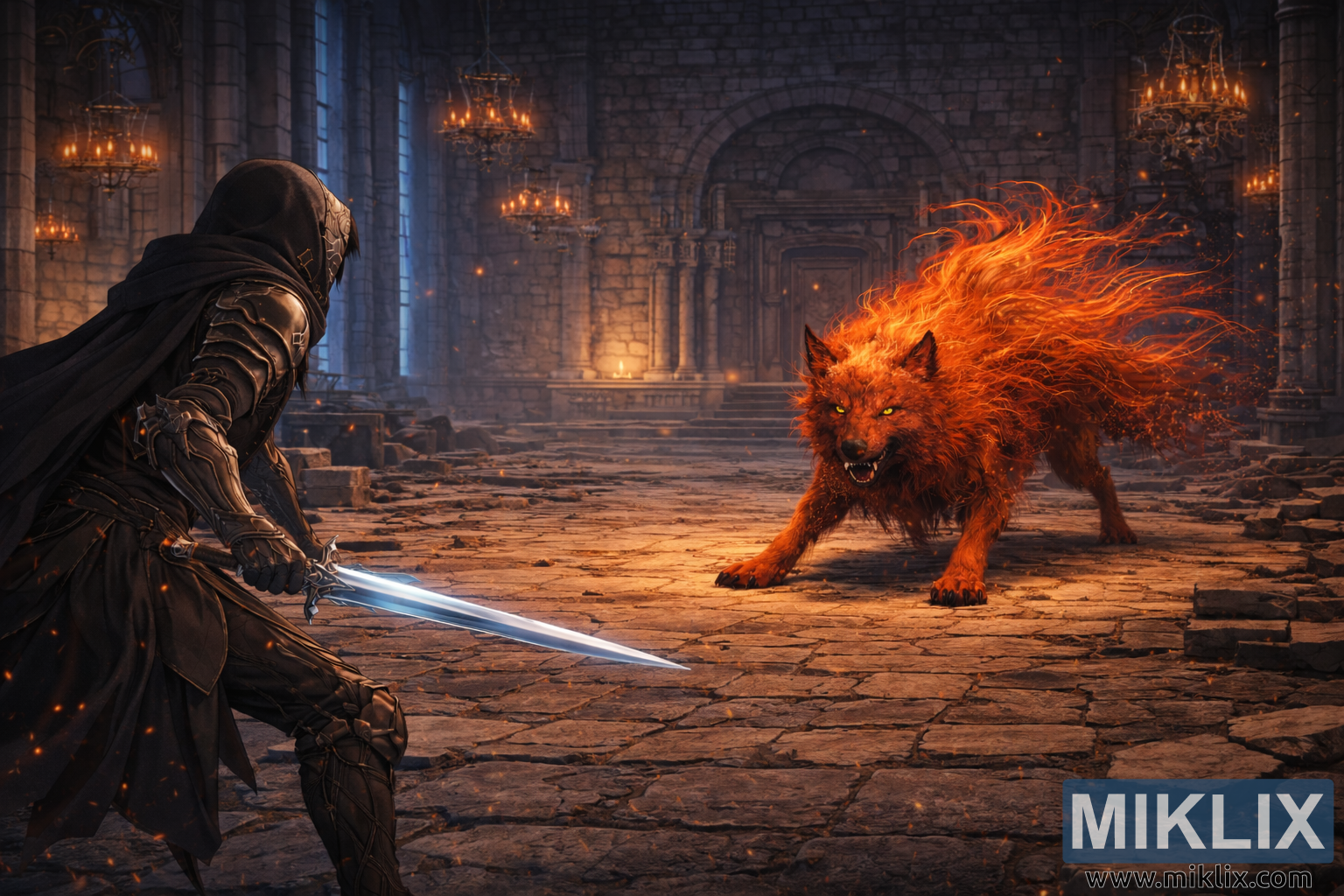 Binibigyang-diin ng mas malawak na tanawin ang laki ng kapaligiran at ang marupok at masiglang distansya sa pagitan ng dalawang pigura. Nakunan ng eksena ang isang nakatigil na tibok ng puso kung saan nagtatagpo ang katahimikan, takot, at determinasyon. Ang kaibahan sa pagitan ng anino at apoy, bakal at apoy, kalmadong disiplina at mabangis na kapangyarihan ang nagbibigay-kahulugan sa imahe, na bumabalot sa nakababahalang kagandahan at nakamamatay na tensyon ng mundo ng Elden Ring.