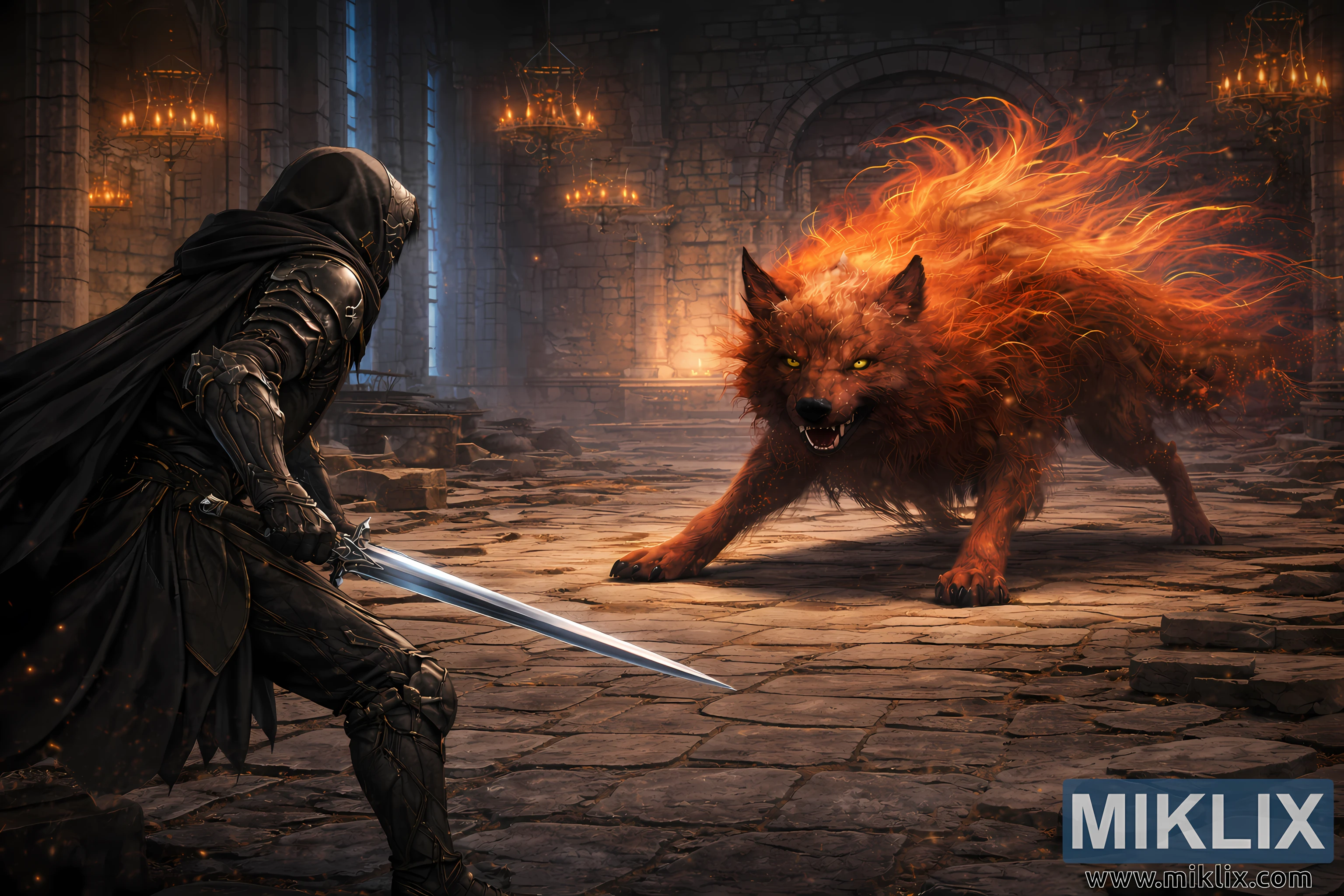 Ang larawan ay naglalarawan ng isang madilim na pantasya, semi-makatotohanang eksena na nakalagay sa loob ng guhong loob ng Raya Lucaria Academy, na kumukuha ng isang nakakapanabik na sandali bago sumiklab ang labanan. Ang pangkalahatang istilo ng biswal ay lumipat mula sa pinalaking estetika ng anime patungo sa isang mas grounded, painted realism, na nagbibigay-diin sa tekstura, ilaw, at bigat. Ang bulwagan ng akademya ay malawak at kahanga-hanga, gawa sa lumang kulay abong bato na may matatayog na pader, mabibigat na arko, at makakapal na haligi na kumukupas sa anino sa itaas. Ang mga palamuting chandelier ay nakasabit sa kisame, ang kanilang mga kumikislap na kandila ay naglalabas ng mainit at hindi pantay na liwanag sa basag na sahig na bato. Ang mas malamig na asul na ilaw ay sumasalamin sa matataas na bintana at malalayong sulok, na lumilikha ng isang malungkot na kaibahan na nagpapakita ng sinauna at pinagmumultuhan na kapaligiran ng bulwagan. Ang alikabok, baga, at mahinang kislap ay lumulutang sa hangin, na nagmumungkahi ng nagtatagal na mahika at ang resulta ng matagal nang nakalimutang mga tunggalian.