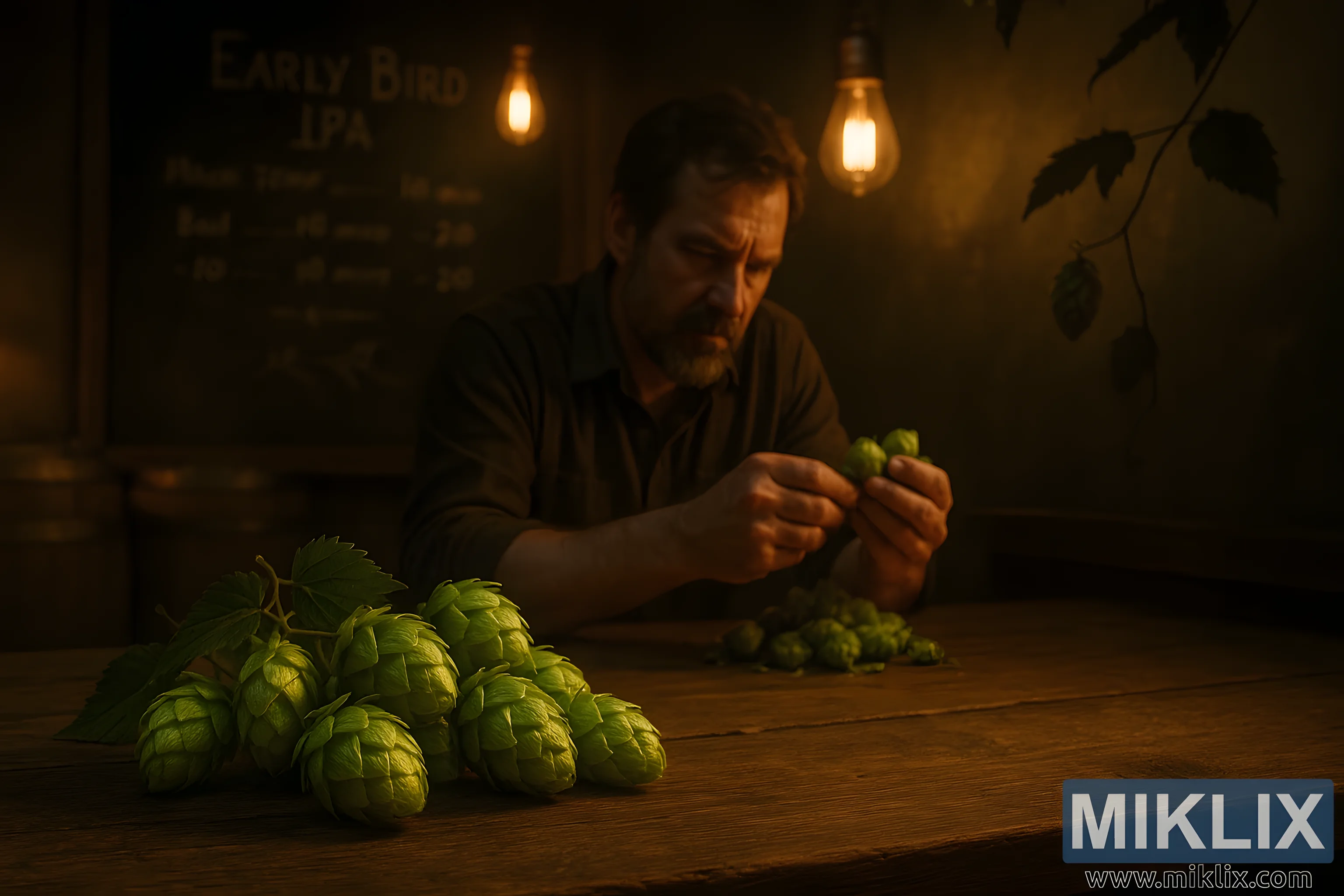Un atelier de brasserie chaud et faiblement éclairé où un brasseur étudie le houblon hâtif, reflétant les défis et l’art de la fabrication de la bière avec cette variété unique.