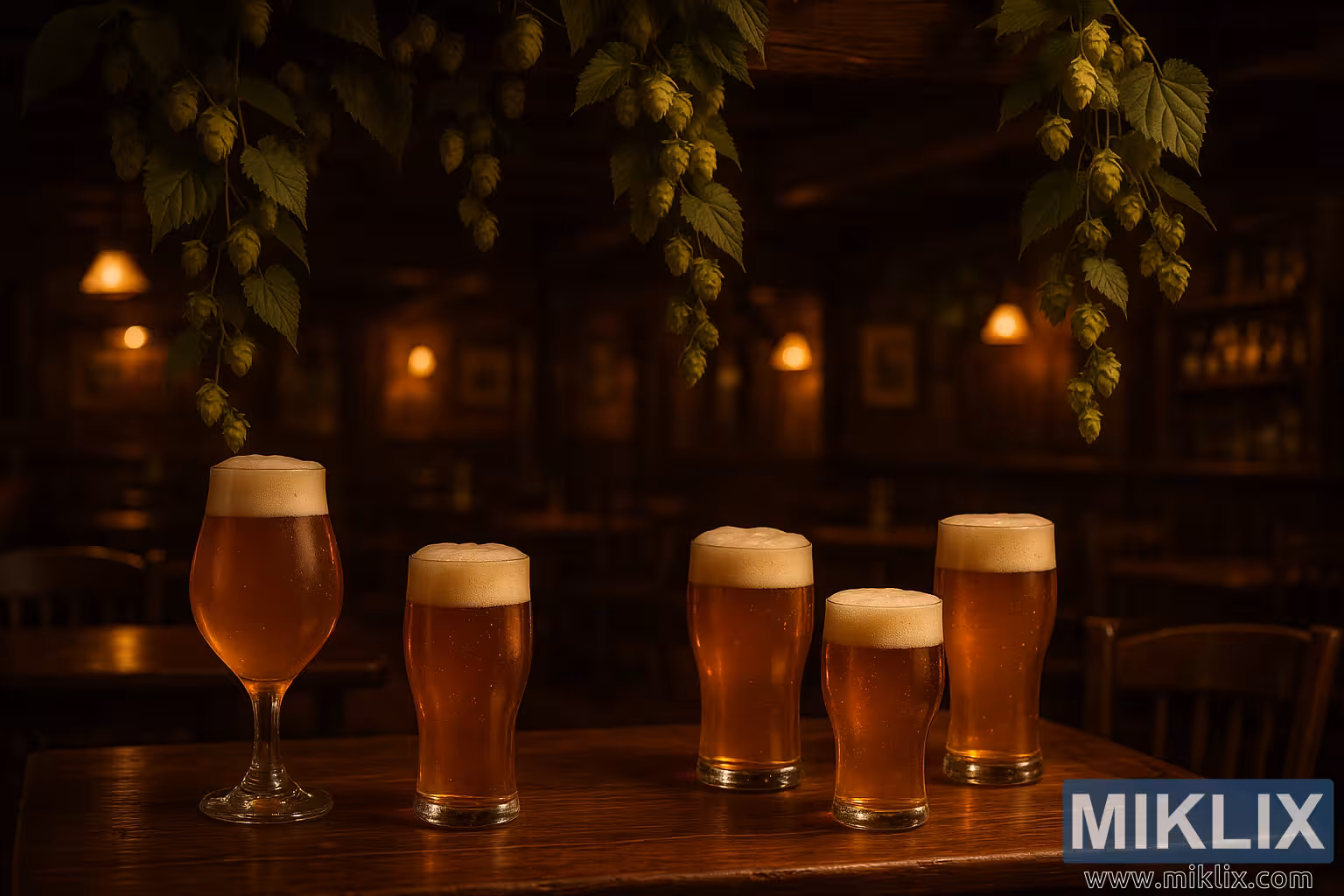 À l’intérieur d’un pub rustique, des bières dorées reposent sur une table en bois sous une lumière ambrée douce, avec des vignes de houblon frais qui s’étendent sur des poutres en bois, évoquant la tradition artisanale et l’hospitalité chaleureuse.