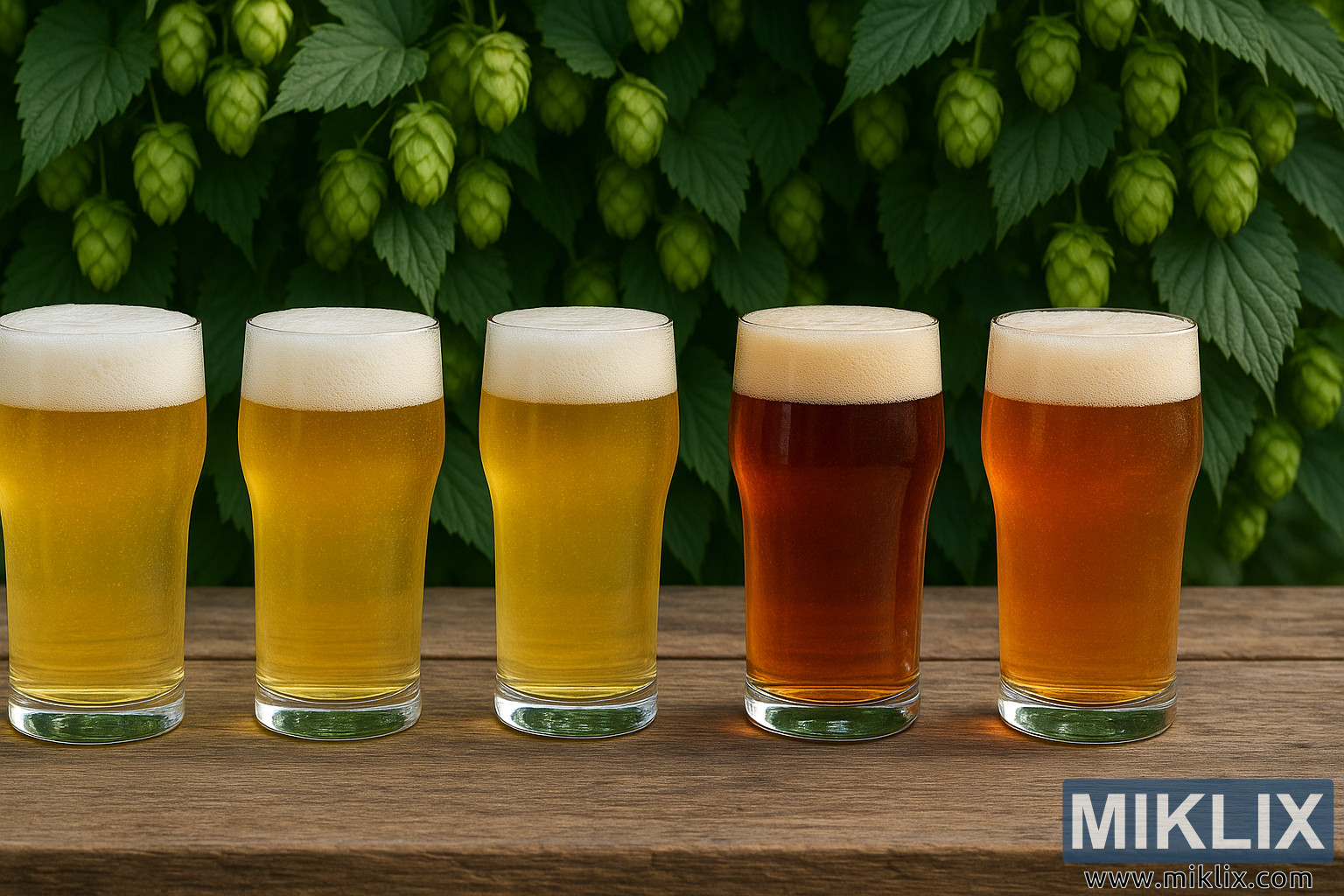 Cette image représente cinq styles distincts de bière — allant de l’or pâle à l’ambre profond — disposés soigneusement en ligne droite sur une table rustique en bois. Chaque bière est servie dans un verre à pinte transparent et légèrement courbé, permettant au spectateur d’apprécier les différences de couleur, de clarté et de structure mousseuse entre les styles. Les trois premières bières, plus claires, présentent des tons vifs de la paille à l’or avec une fine effervescence visible à travers le verre. Leurs têtes en mousse sont lisses et crémeuses, se déposant uniformément sur le dessus. La quatrième bière est d’une couleur ambrée riche, plus profonde et plus cuivrée, avec une tête légèrement plus dense et plus texturée. La dernière bière présente un caractère doré-orangé chaleureux, brillant subtilement avec un rétroéclairage qui met en valeur sa clarté et sa carbogéation. La table en bois a un grain naturel usé qui apporte une chaleur terreuse à la composition, ancrant la rangée de verres. Derrière la table s’élève un mur vif de bacs de houblon Kitamidori verts, remplis de cônes de houblon dodus et de larges feuilles dentelées. Le décor est luxuriant et plein, créant une toile naturelle texturée de feuilles superposées dans différentes nuances de vert. Les cônes de houblon pendent en bonne place, leurs bractées superposées captant une lumière naturelle douce qui met en valeur leurs détails botaniques. L’éclairage tout au long de la scène est doux et diffus, suggérant un décor extérieur lors d’une journée couverte ou en fin d’après-midi. La composition générale est équilibrée et accueillante, combinant le charme rustique de la table en bois avec la fraîcheur des plants de houblon et la diversité visuelle attrayante des bières. L’image transmet un sentiment de savoir-faire, de connexion agricole et d’appréciation de la diversité des saveurs et de l’esthétique que l’on retrouve dans les styles traditionnels de la bière. Il évoque l’atmosphère d’une brasserie, d’une ferme de houblon ou d’un événement de dégustation, offrant une célébration visuelle de la culture de la bière et des ingrédients qui la façonnent.