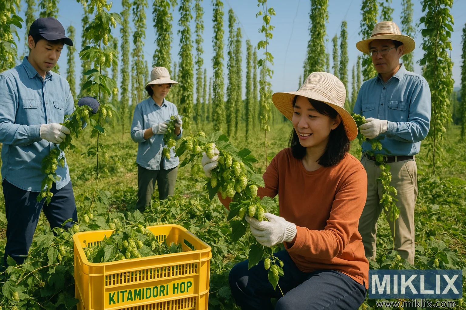 Image: Récolte du houblon Kitamidori dans un champ ensoleillé