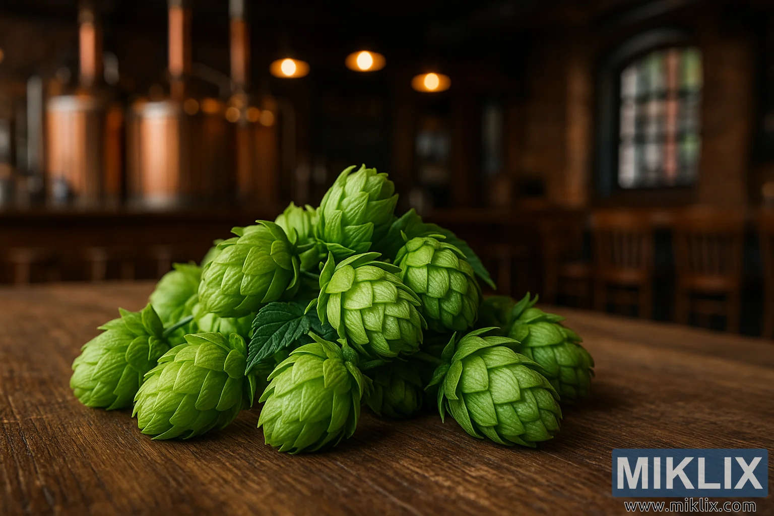 L’ambiance transmise est celle de l’authenticité et du savoir-faire. La scène semble naturelle et non posée, comme si le houblon avait été posé momentanément par un brasseur préparant la prochaine étape du brassage. L’image célèbre la richesse sensorielle d’une culture brassicole axée sur le houblon : la fraîcheur tactile des cornets frais, le parfum terreux qu’ils évoquent, et la chaleur d’un cadre traditionnel de brewpub. Dans l’ensemble, cela crée un portrait vivant de la fraîcheur, de la pratique artisanale et du charme de la brasserie en petites quantités.