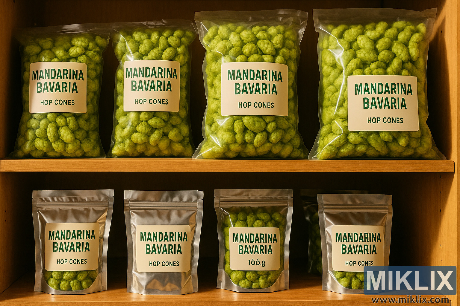 L’étagère du haut est remplie de sacs de plastique transparents plus grands, bien remplis de cornets de houblon dodus. Chaque sac est transparent, permettant à la couleur verte vive et fraîche du contenu de dominer la scène. Chaque emballage est apposée une étiquette épurée et minimaliste avec des lettres vertes en gras indiquant « Mandarina Bavaria » et « Hop Cones ». L’uniformité des étiquettes et la constance de l’emballage créent un sentiment de cohésion et de fiabilité de la marque. Les cônes de houblon dans ces sacs semblent particulièrement pleins et robustes, ce qui suggère leur adéquation pour les brasseurs recherchant de plus grandes quantités sans compromettre la qualité.