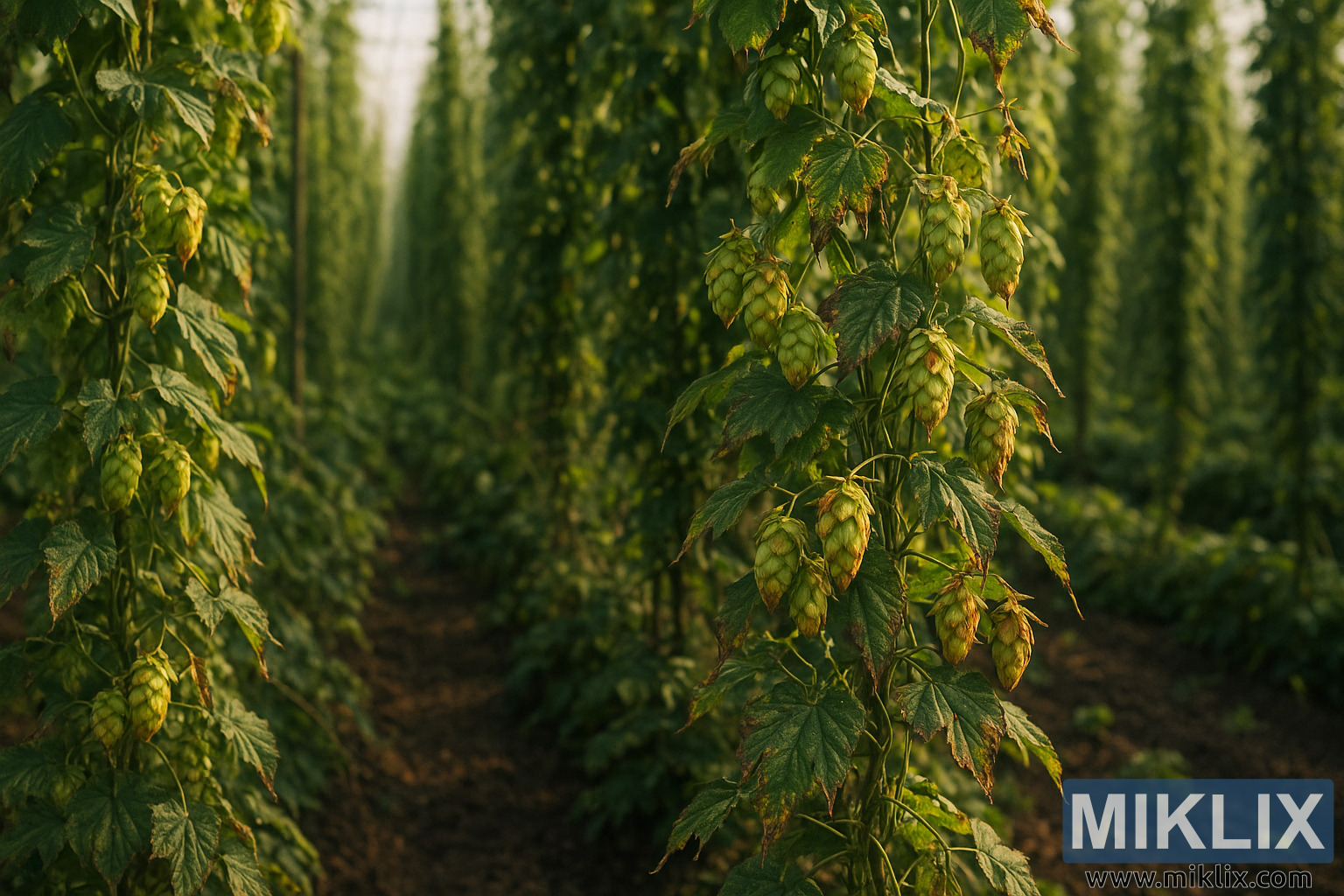 L’image montre un champ de houblon luxuriant mais troublé, montrant de longues rangées de bines de houblon Mandarina Bavaria s’étendant vers l’horizon. Les plantes poussent le long de hautes lignes de treillis, leurs lianes tortueuses s’entrelaçant en gros grappes entrelacées. La lumière du soleil filtre à travers le feuillage à un angle bas, suggérant tôt le matin ou la fin d’après-midi, et projette des ombres douces et tachetées sur le sol brun riche entre les rangées. Bien que la scène générale semble vibrante et saine à première vue, un examen plus attentif révèle des signes croissants de détresse qui indiquent un problème plus profond affectant la culture.