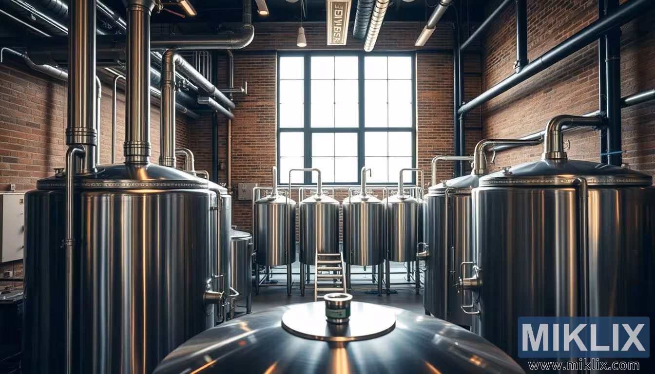 Une salle de brassage moderne avec des bouilloires, des réservoirs et des tuyaux en acier inoxydable sous une lumière chaude, mettant en valeur la précision et l’artisanat dans le brassage avec le houblon Spalter Select.