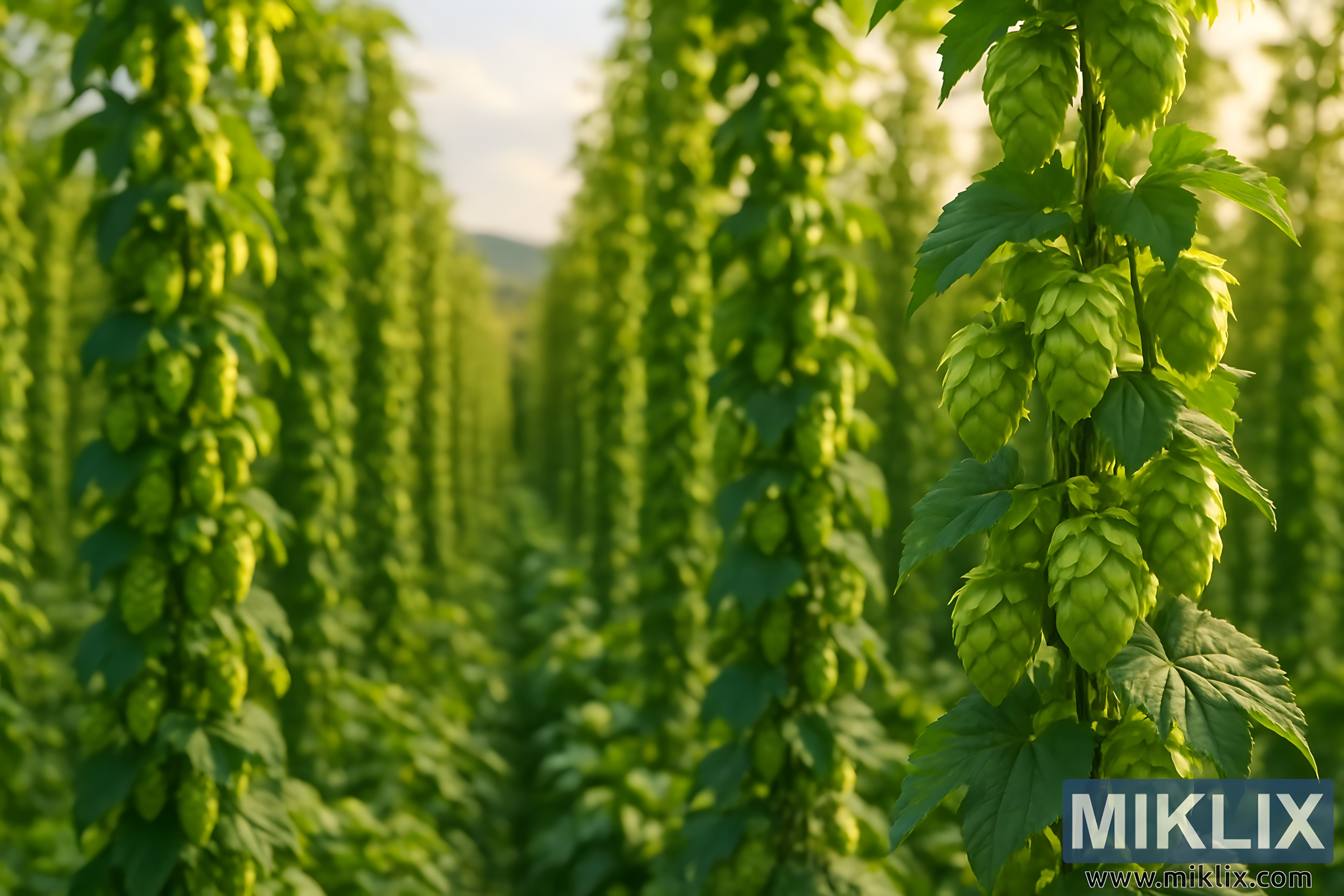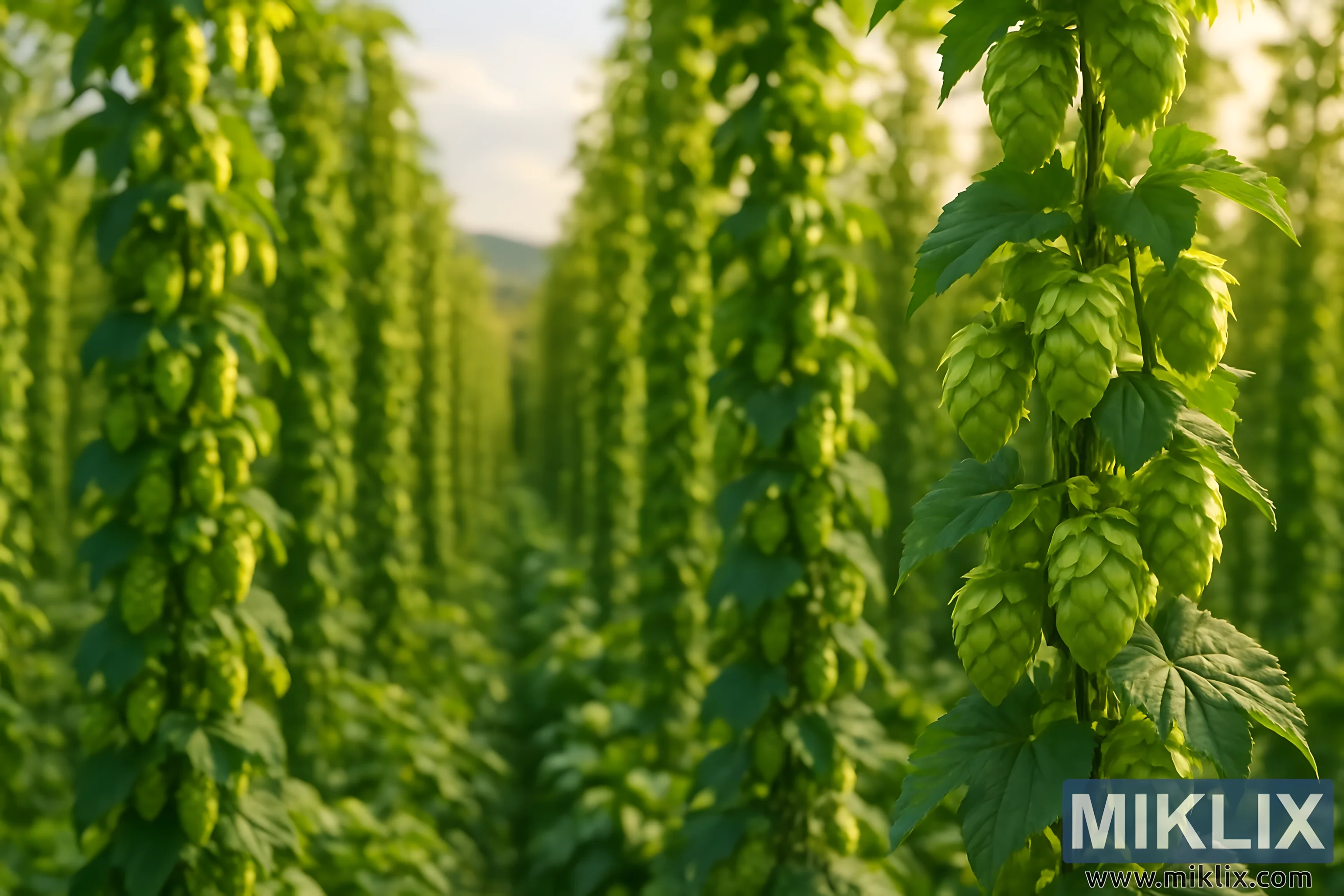 En arrière-plan, les rangées de plants de houblon s’estompent dans une brume luxuriante, finissant par rejoindre les contours de collines lointaines. La terre vallonnée au-delà offre un sentiment de lieu et de contexte, ancrant la scène dans une campagne pastorale. Au-dessus, des aperçus d’un ciel pâle perçoivent, teinté d’une chaleur dorée qui suggère que la journée avance doucement vers le soir. L’atmosphère est sereine, presque idyllique, évoquant la sensation de se tenir au milieu d’une ferme florissante pendant la saison des récoltes.