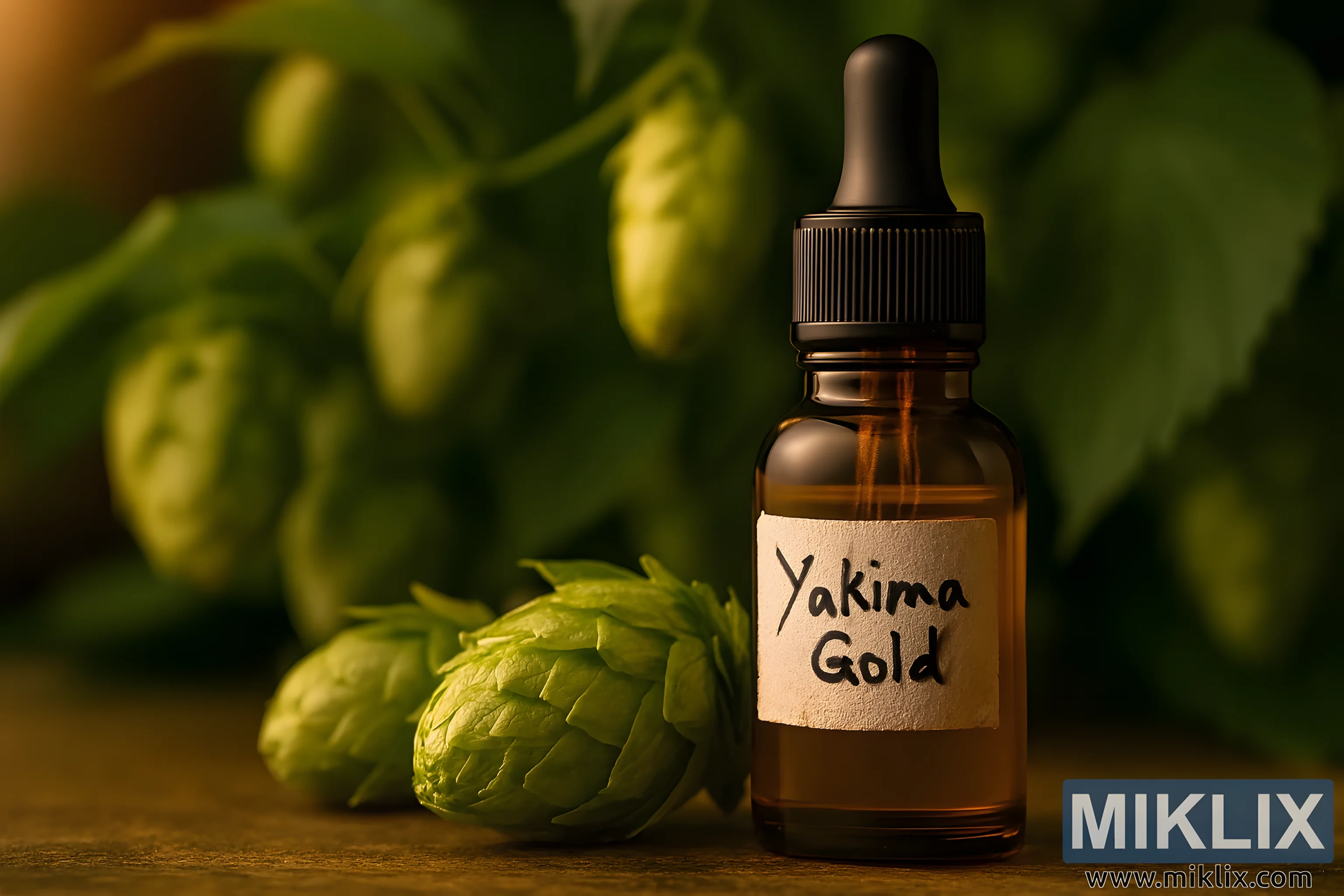 La composition est équilibrée et harmonieuse. La bouteille est légèrement décentrée, encadrée par le houblon et les feuilles environnants. Les tons chauds de l’huile et du bois contrastent magnifiquement avec les verts froids du feuillage, créant une palette à la fois accueillante et terreuse. L’image transmet la richesse sensorielle du houblon Yakima Gold — pas seulement leur attrait visuel, mais aussi leur complexité aromatique et leur importance dans le brassage artisanal et les applications botaniques.