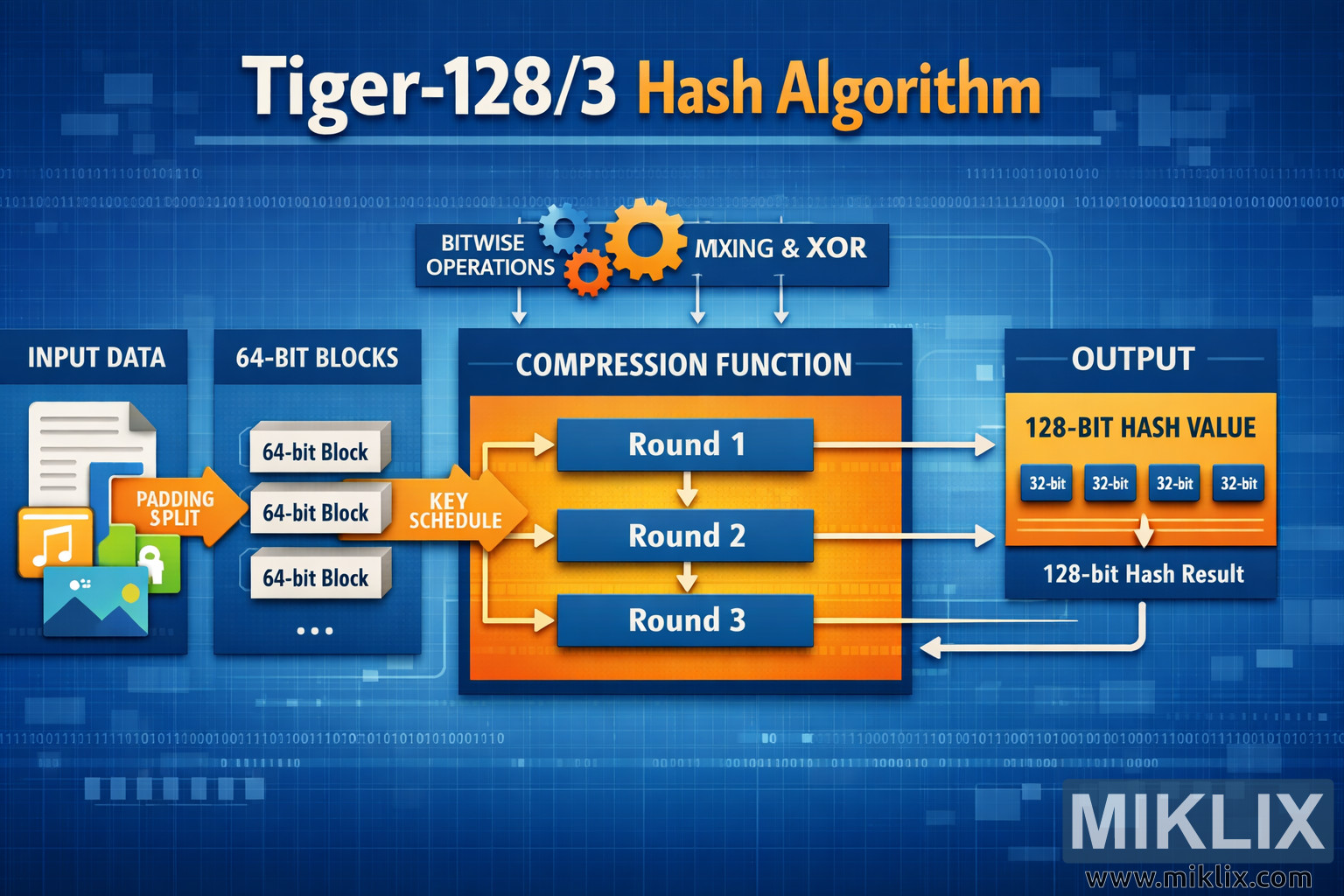 L’image est une infographie numérique large, orientée paysage, qui visualise l’algorithme de hachage Tiger-128/3 de manière simplifiée et éducative. L’arrière-plan est une grille bleue à thème technologique, remplie de chiffres binaires subtils et de lignes lumineuses, donnant l’impression que des données circulent dans un système. En haut au centre, un grand titre indique « Tiger-128/3 Hash Algorithm » en lettres blanches et orange en gras, établissant immédiatement le contexte du diagramme.