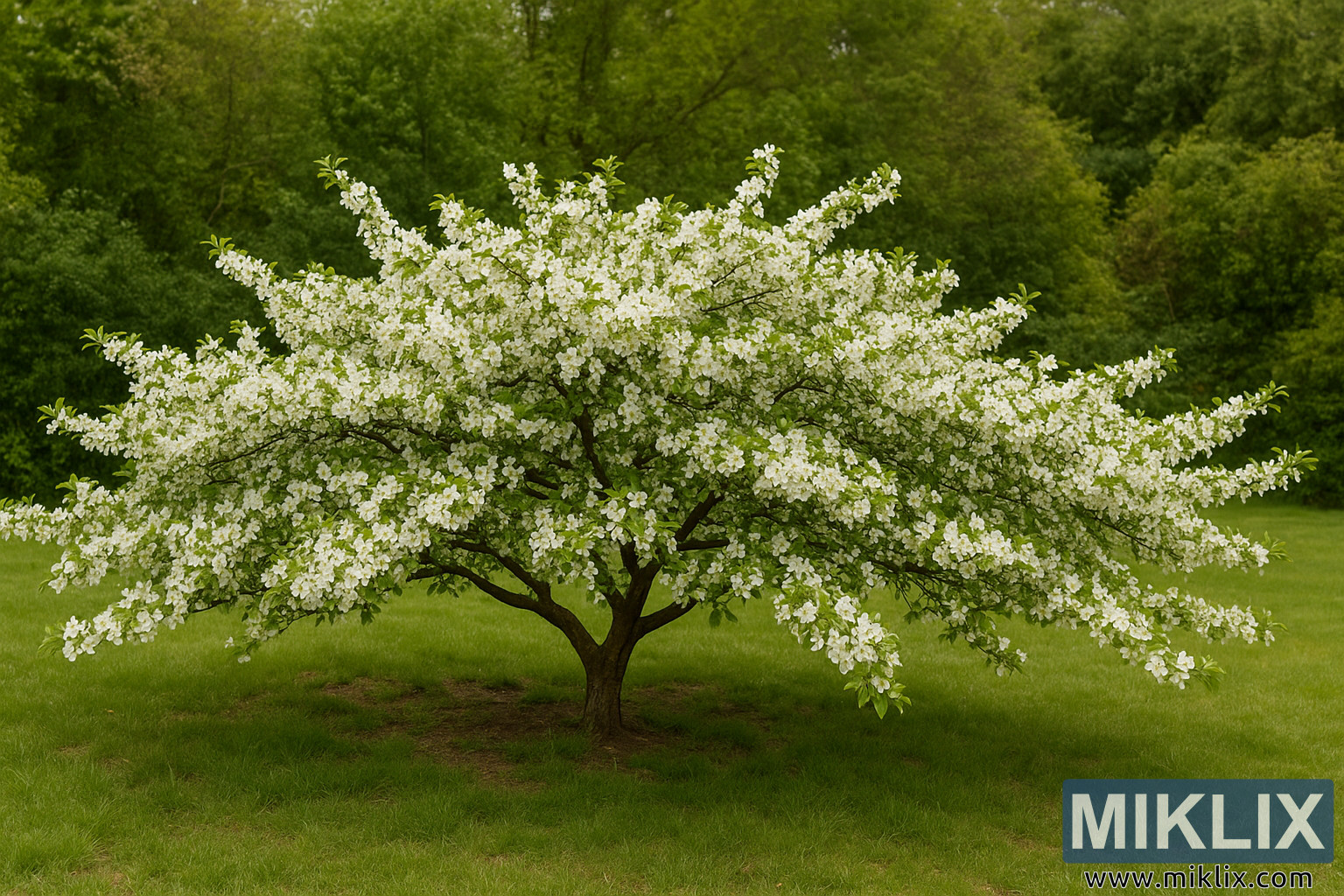 Un magnifique pommier Sargent (Malus sargentii) affichant son habitude caractéristique d’étendue horizontale et ses fleurs blanches denses, idéal pour les jardins compacts et les paysages printaniers.