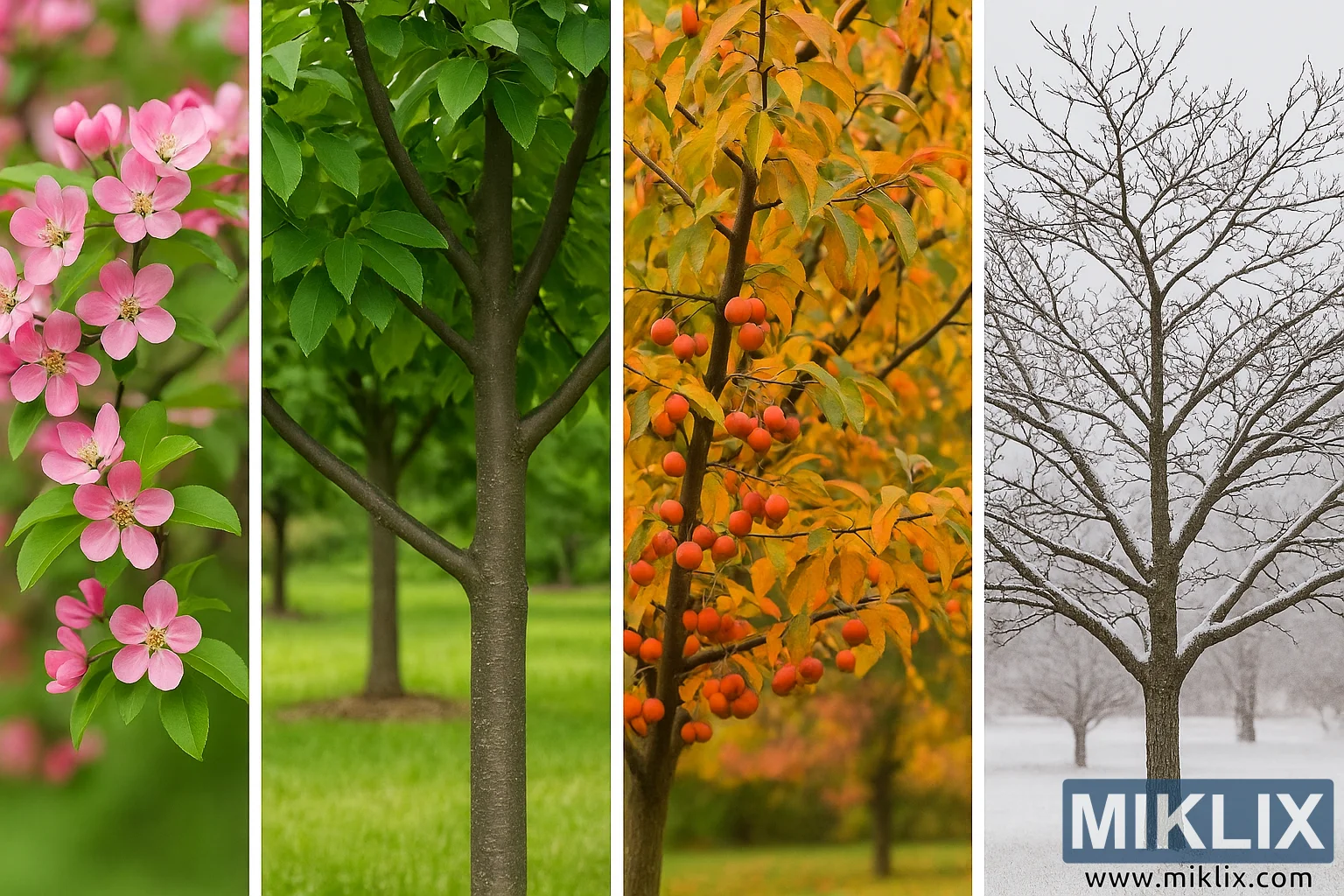 Cette image axée sur le paysage présente un récit visuel captivant d’un pommier sauvage qui se transforme à travers les quatre saisons, soulignant son attrait ornemental durable. Divisé en quatre panneaux verticaux distincts, chaque section représente le même pommier sauvage ou un arbre similaire à une période différente de l’année, offrant une représentation vivante et éducative du changement saisonnier de cette espèce ornementale adorée.