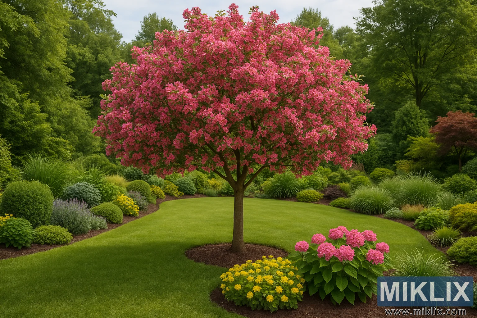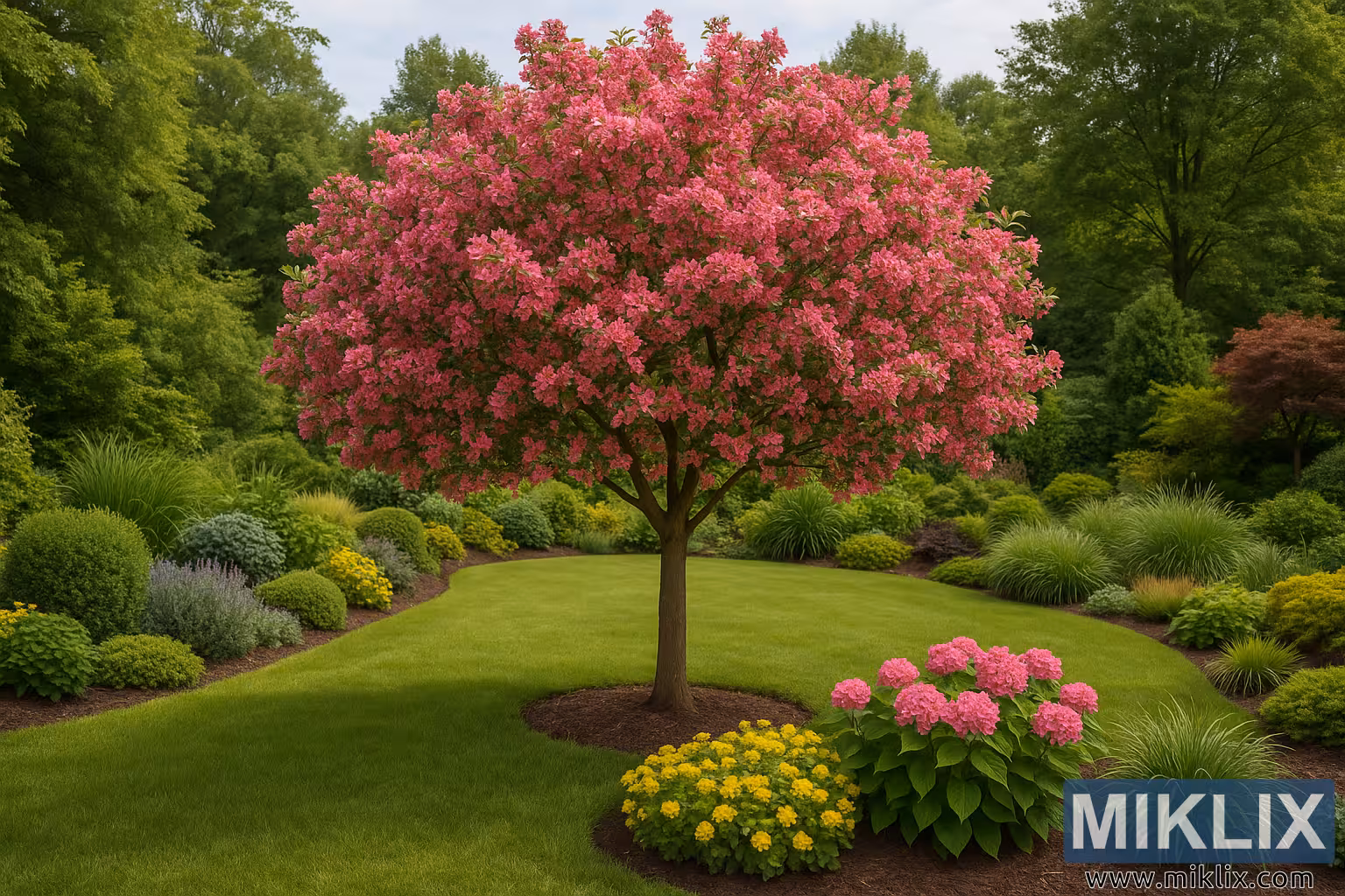 À l’avant de l’arbre, des grappes de fleurs vivaces jaune vif contrastent joyeusement avec les hortensias roses à proximité, ajoutant à la fois vitalité et profondeur à la composition. Le paillis entourant chaque plate-bande est soigneusement entretenu, soulignant la précision et le soin nécessaires à l’entretien du jardin. En arrière-plan, une variété d’arbres matures — chêne, érable et possiblement redbud — forment un fond vert dense, offrant de l’ombre et encadrant le pommier sauvage comme véritable pièce maîtresse de l’espace.