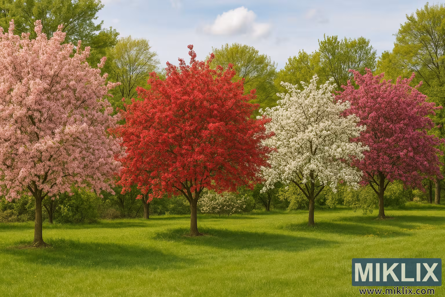 Cette photographie de paysage haute résolution capture une scène printanière à couper le souffle, mettant en valeur plusieurs variétés de pommiers sauvages en pleine floraison, disposés dans un parc doucement vallonné. La composition présente un équilibre parfait entre couleur, forme et texture, illustrant la remarquable diversité que l’on trouve parmi les cultivars ornementaux de pommier sauvage. Au premier plan, quatre arbres proéminents se dressent en une disposition semi-linéaire sur un tapis d’herbe luxuriante d’un vert émeraude. Chaque arbre présente une variété et une couleur de fleurs distinctes, mettant en valeur la diversité des tons floraux qui font des pommiers sauvages parmi les espèces ornementales les plus admirées des jardins tempérés.