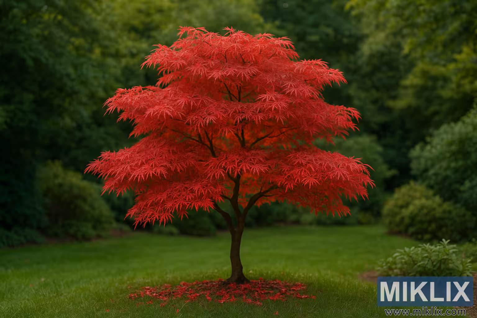 Toute la scène est encadrée par un arrière-plan riche et profond de verdure variée. Entourant immédiatement la pelouse, une bordure continue d’arbustes denses et vert foncé et de feuillage mature crée un fond solide et uniforme. Ce rideau sombre de vert sert à isoler l’érable cramoisi, assurant qu’il demeure le point focal incontesté. Les nuances plus profondes de vert — allant de l’olive au vert forêt — apportent une profondeur visuelle et suggèrent que l’arbre est situé dans un environnement naturel isolé. La combinaison de la structure délicate de l’érable, de sa couleur intense et singulière, et du cadre vert riche et froid crée un profond sentiment de sérénité et de beauté dramatique. La photographie capte avec succès le statut intemporel de l’érable japonais comme l’un des arbres ornementaux les plus admirés et visuellement les plus valorisants du design paysager classique, célébré pour le mariage parfait entre forme et couleur saisissante.