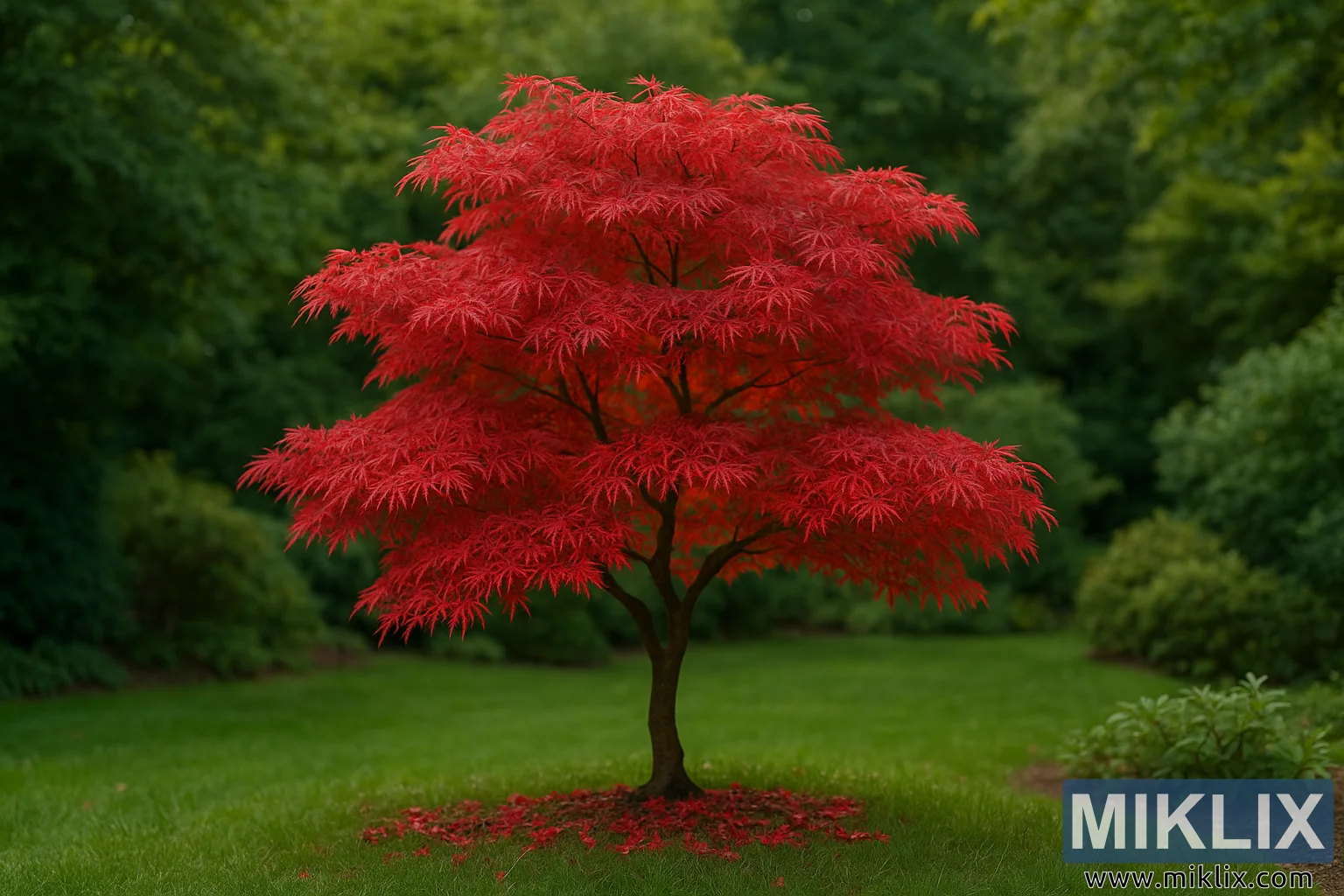 L’arbre est soutenu par un tronc mince et foncé et des branches qui émergent bas du sol. Le tronc, bien que non massif, possède une texture raffinée et une légère courbure qui renforce l’élégance et le mouvement de l’arbre. À la base du tronc, le sol est recouvert d’une fine couche nette de paillis foncé, qui se transforme parfaitement en un tapis subtil de feuilles mortes. Ces feuilles éparses sont du même cramoisi vif que la canopée, prolongeant visuellement la couleur de l’arbre sur le plan du sol et ancrant la couronne flamboyante dans l’environnement immédiat. Ce détail renforce le contexte saisonnier et ajoute une touche de délabrement naturel et magnifique à la scène soigneusement entretenue.