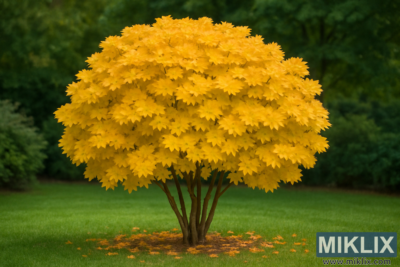 Un érable de pleine lune avec une canopée dorée brillante et de larges feuilles arrondies se dresse dans un jardin d’automne serein, créant un point focal radieux.