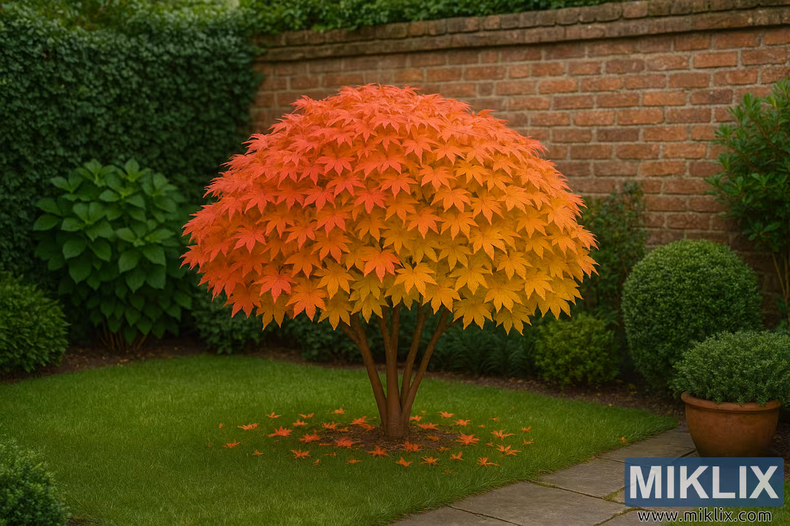 Baignée d’une lumière douce et diffuse, la scène atteint un équilibre parfait entre vivacité et calme. La lumière révèle chaque subtil changement de couleur dans les feuilles sans projeter d’ombres agressives, assurant que le dégradé du rouge à l’orange puis à l’or peut être pleinement apprécié. L’érable semble rayonner de chaleur dans le jardin, servant à la fois de pièce maîtresse et d’atmosphère, transformant l’espace en un sanctuaire de beauté saisonnière. La composition globale parle d’harmonie, où chaque élément — le mur de briques, les arbustes, la pelouse et le sentier — a été arrangé pour mettre en valeur l’éclat de cet arbre unique.
