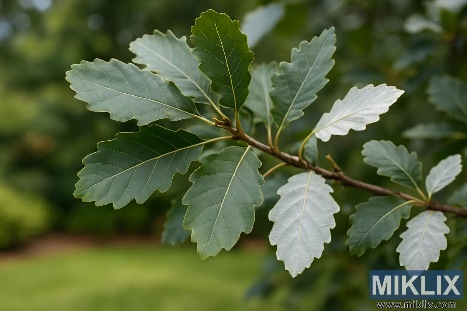 L’arrière-plan est rendu dans un flou doux et profond (bokeh), principalement composé de verts moyens à clairs, suggérant une pelouse floue et un feuillage lointain. Cet environnement doucement diffusé crée un rideau parfait et naturel qui pousse les feuilles nettement focalisées vers l’avant, assurant que l’attention du spectateur reste fixée sur les subtilités du feuillage bicolore. La lumière douce et naturelle est essentielle, mettant en valeur la brillance lisse des surfaces supérieures tout en mettant en lumière la texture subtile des dessous argentés. L’effet global est celui de sérénité et de précision botanique, capturant la beauté unique et l’élégance bicolore caractéristique du chêne blanc des marais dans un moment de grâce silencieuse.