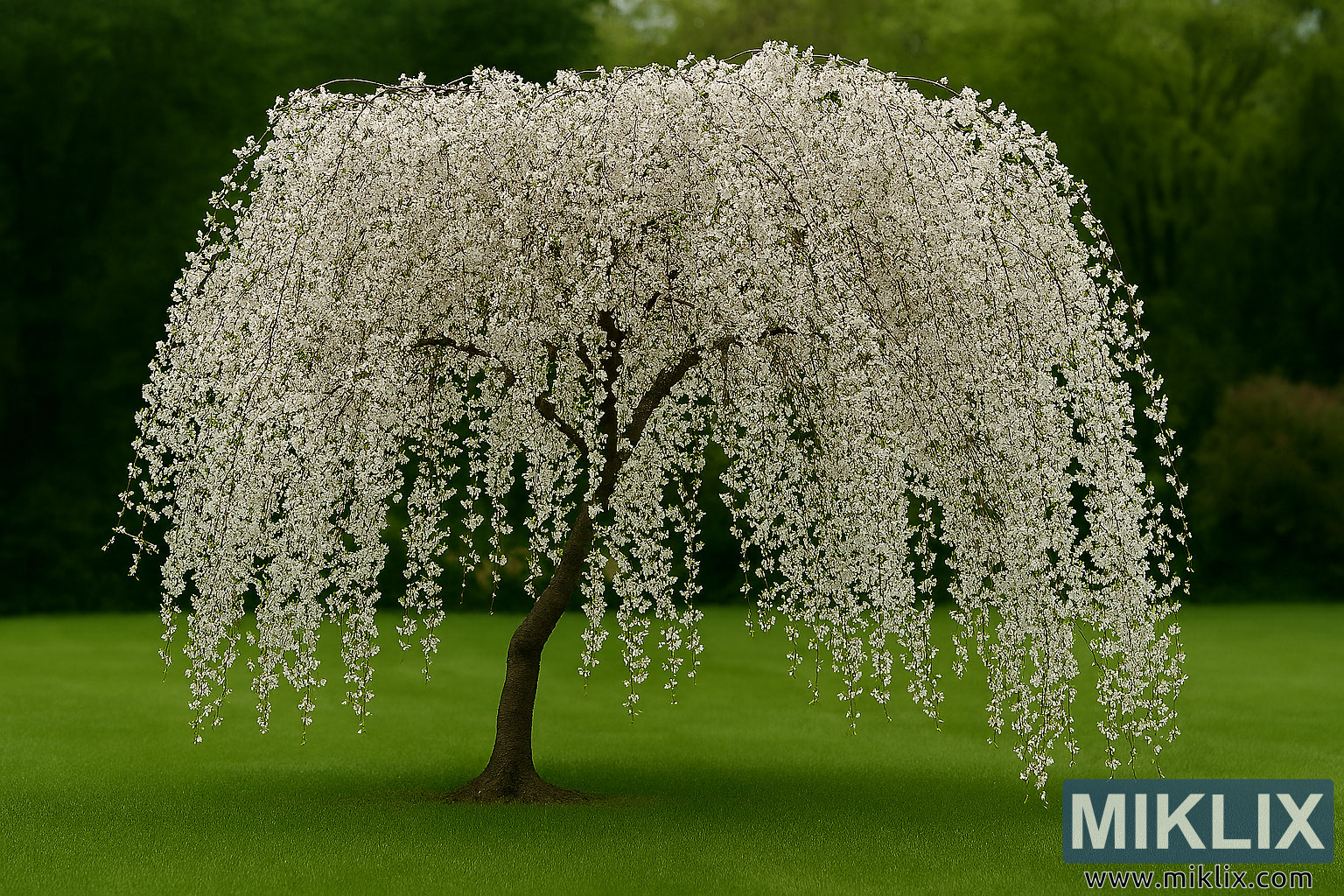 Cette image de paysage haute résolution capture un cerisier pleureur des fontaines de neige (Prunus 'Snofozam') en pleine floraison printanière, debout gracieusement sur une pelouse verte vibrante. La forme de l’arbre est frappante et sculpturale, définie par ses branches dramatiques et en cascade qui descendent en arcs élégants, créant une silhouette en cascade. Le tronc est brun foncé, légèrement courbé, et texturé d’une écorce rugueuse, ancrant visuellement l’arbre au centre de la composition.