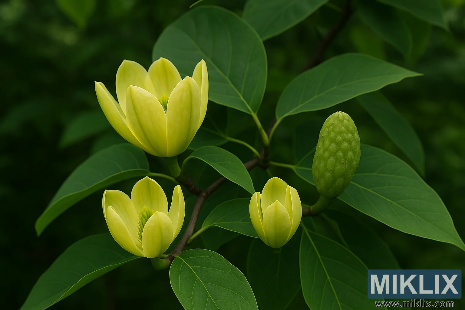Cucumber Magnolia in Bloom with Tulip-Shaped Flowers and Green Fruit