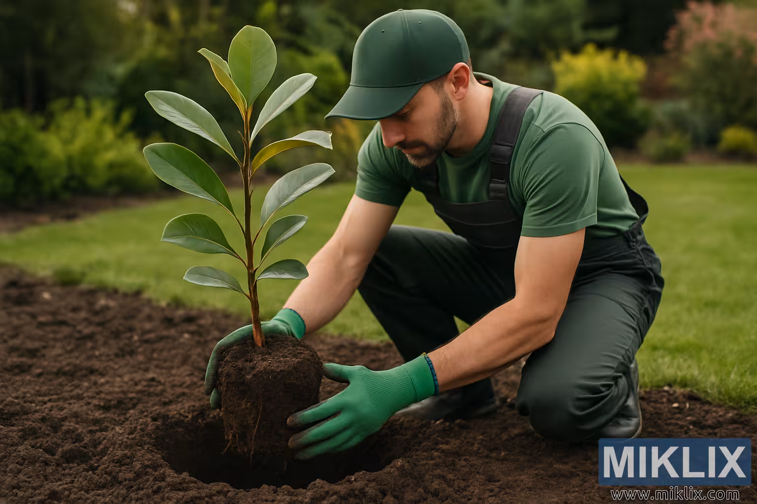Dans cette photographie de paysage réaliste, un jardinier est capturé en train de planter un jeune magnolia dans un plate-bande bien préparé. La composition équilibre le détail naturel, les tons terreux et un sentiment de diligence calme. Le jardinier, vêtu d’une casquette vert foncé, d’une chemise à manches courtes et d’une salopette robuste, s’agenouille au premier plan, portant des gants de jardinage vert vif qui contrastent subtilement avec la terre brun foncé. Sa posture transmet concentration et soin alors qu’il place la motte de légumes de magnolia dans un trou fraîchement creusé. Le jeune arbre est petit mais éclatant, avec des feuilles saines et brillantes disposées en un élégant motif vers le haut, suggérant une nouvelle croissance et vitalité.