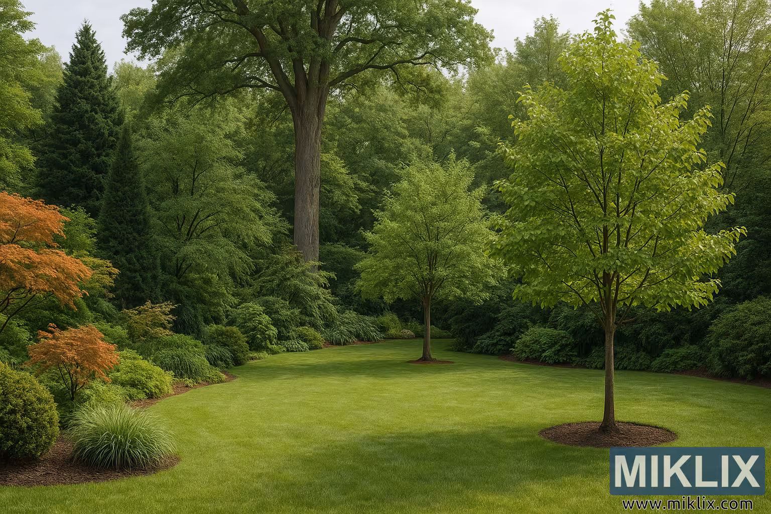 Un jardin bien entretenu avec une pelouse verte, de l’érable japonais, des conifères et une canopée d’arbres en couches dans un cadre naturel paisible.