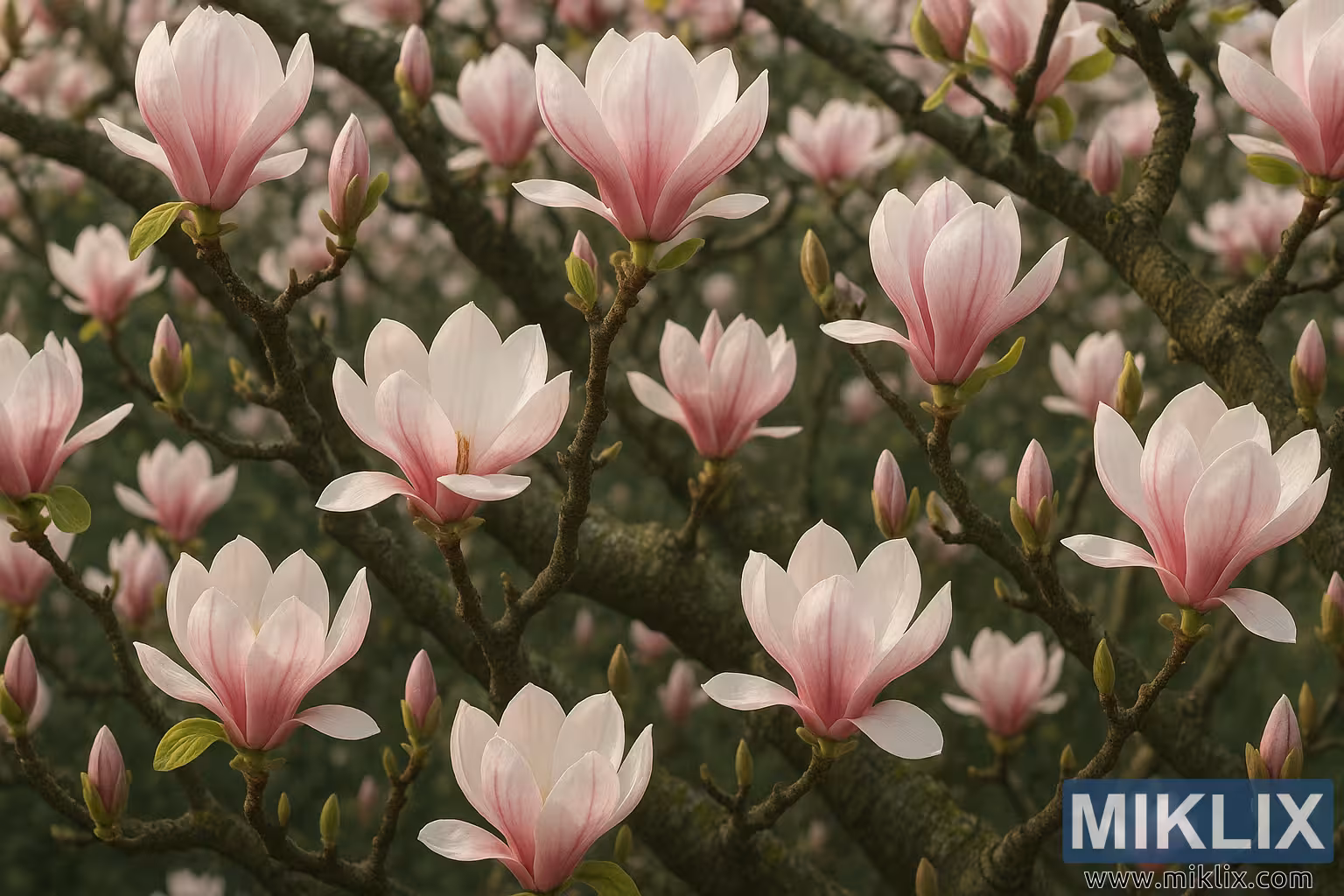 Cette image capture la beauté éphémère et éthérée d’un magnolia en pleine floraison, un moment suspendu au cœur du printemps où la nature semble s’arrêter et savourer sa propre élégance. La composition se concentre sur un réseau dense de branches sombres et noueuses qui se tordent et se courbent avec une force tranquille, leur texture rugueuse formant un contrepoint dramatique aux fleurs douces et lumineuses qui les ornent. Chaque branche est généreusement couverte de grandes fleurs en forme de coupe, leurs pétales se déployant en couches de blanc crème et de rose rosé. Le dégradé de couleurs est subtil mais frappant — des teintes rosées rayonnent à partir de la base de chaque pétale, s’estompant doucement en ivoire pâle aux extrémités, créant un effet aquarelle à la fois délicat et délibéré.