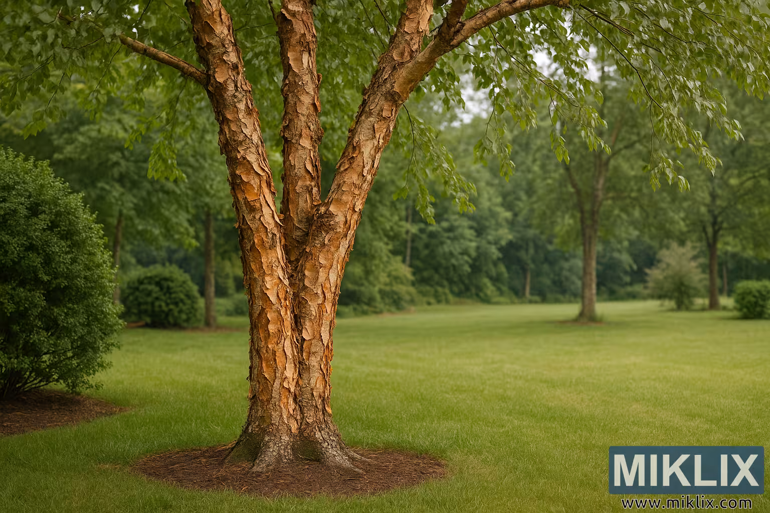 Un bouleau de rivière saisissant à l’écorce cuivrée se dresse au milieu d’un feuillage vert, d’arbustes et d’une pelouse bien entretenue dans un cadre serein semblable à un parc.