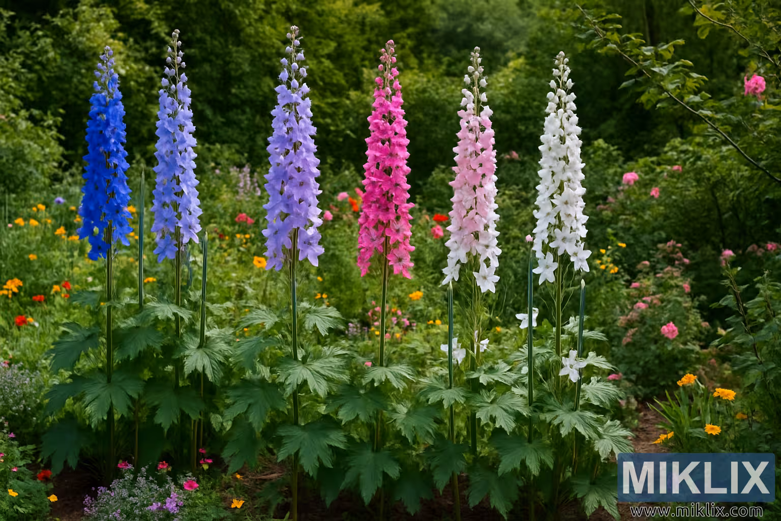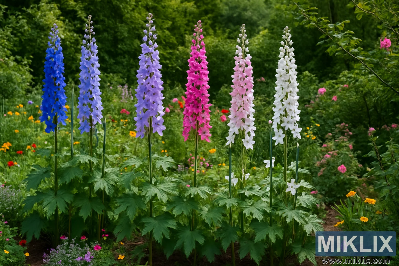 Delphinium Varieties in a Cottage Garden with Proper Spacing and Support
