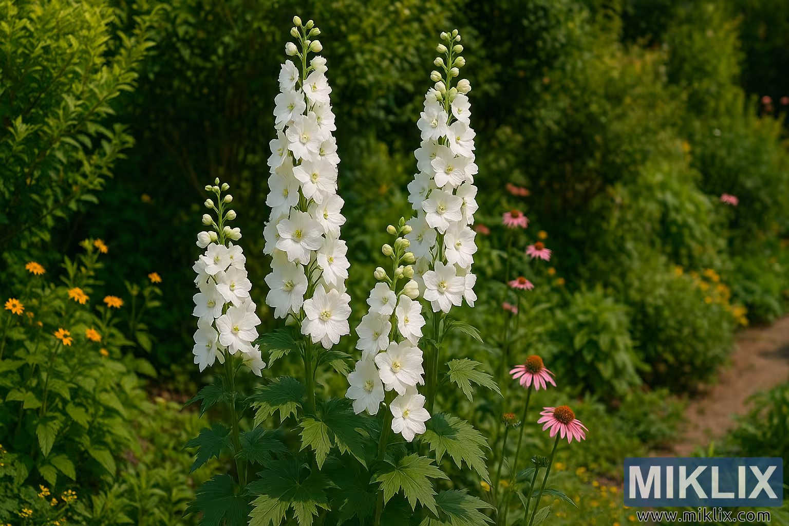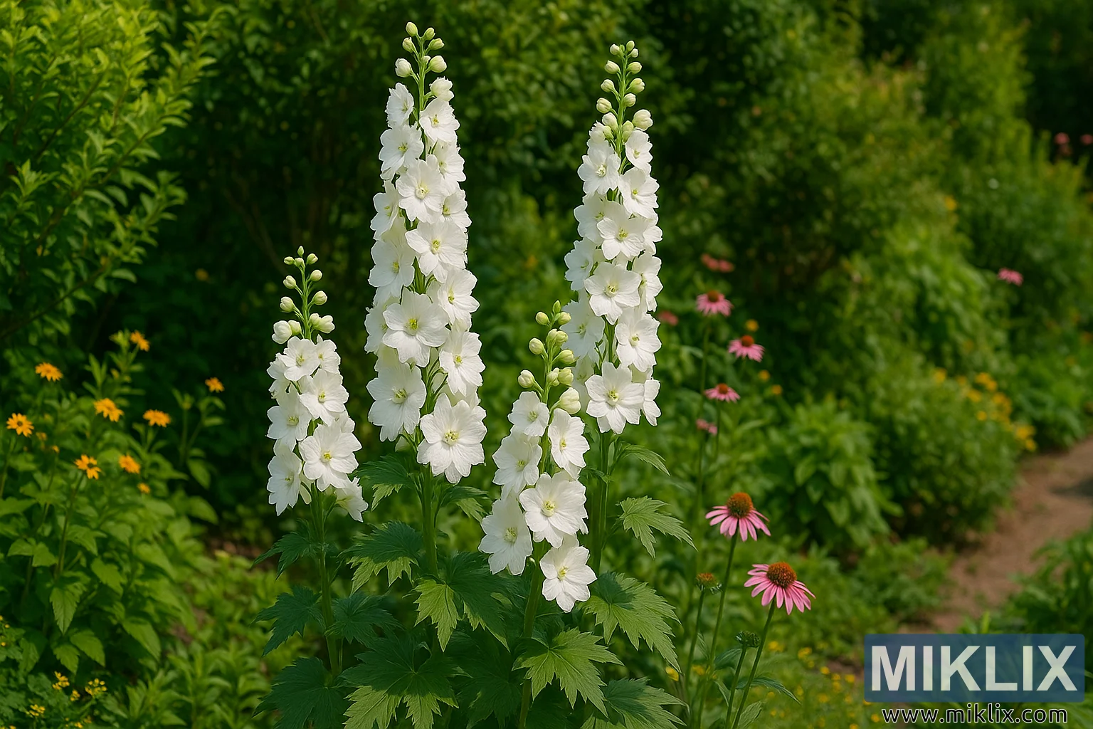 Le feuillage à la base est luxuriant et profondément lobé, typique des delphiniums, offrant une ancre verdoyante aux épines florales qui s’élèvent. Les feuilles ont une texture légèrement dentelée et une finition mate, leur forme large et palmée offrant un contrepoint texturé à l’élégance verticale des tiges florales. Elles servent aussi de fond vert riche qui accentue le blanc éclatant des fleurs au-dessus. Les lignes verticales des delphiniums sont adoucies et équilibrées par la plantation environnante, qui comprend des Rudbeckias jaune vif (susans à yeux noirs) et des échinacées rose doux (échinacées). Ces plantes compagnes offrent un contraste de couleur complémentaire et une continuité saisonnière tout en rehaussant l’ambiance détendue et naturaliste de la bordure.