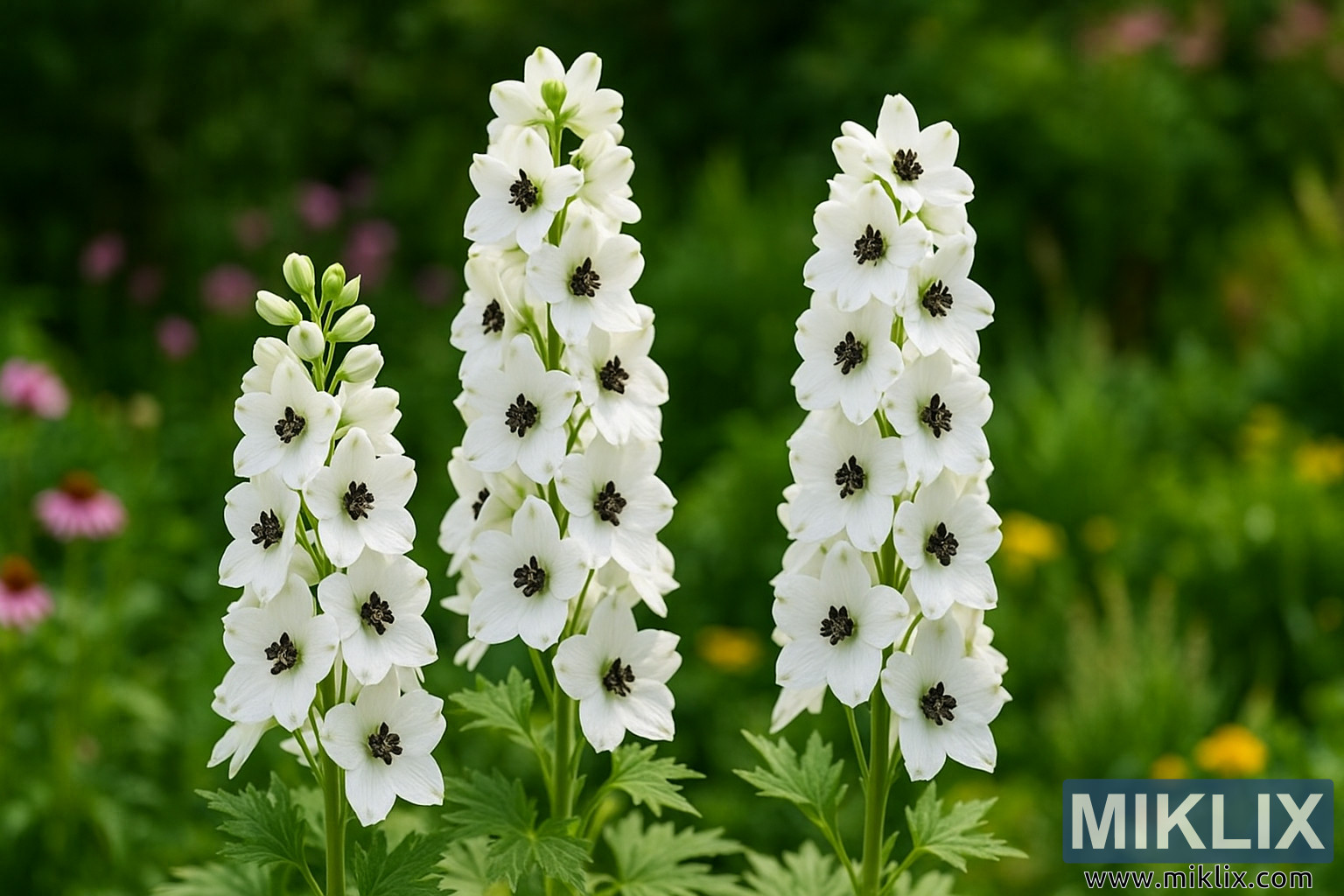 L’image présente un portrait remarquablement élégant de Delphinium « Magic Fountains White », une variété compacte et gracieuse reconnue pour ses fleurs blanches pures et ses centres d’abeilles noirs contrastants. Capturée en haute résolution et en orientation paysage, la photo se concentre sur trois majestueuses pointes florales s’élevant fièrement d’une base de feuillage vert riche. Les fleurs ressortent vivement sur un arrière-plan de jardin doucement flou, rempli de verdure luxuriante et de touches de fleurs complémentaires, créant une composition à la fois dramatique et sereine — une représentation par excellence d’une bordure vivace de style cottage à son apogée.