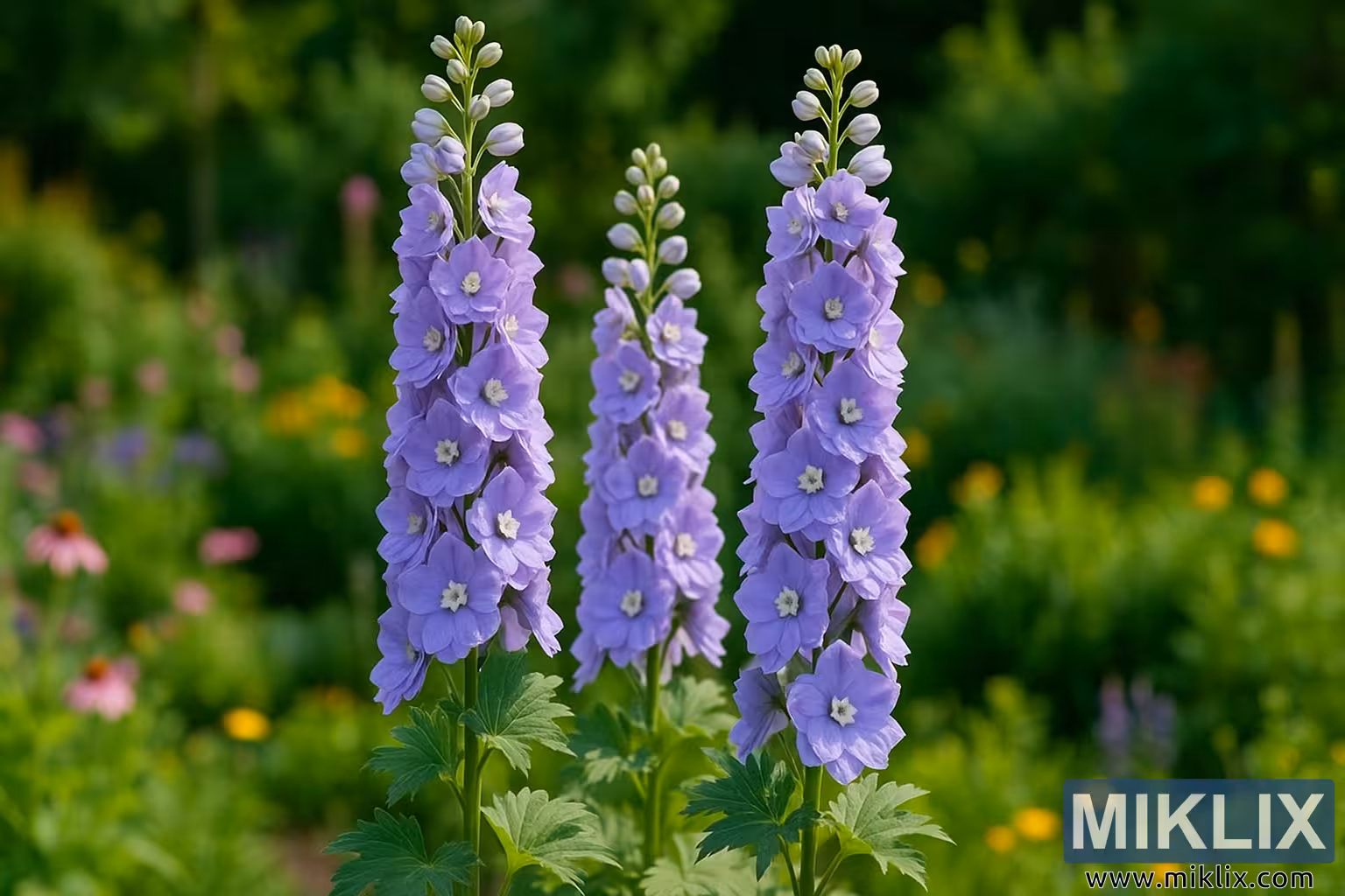 L’image présente une vue d’une beauté frappante et très détaillée du Delphinium « Aurora Lavender », capturé en pleine floraison dans un cadre de jardin luxuriant. Prise en orientation paysage et en haute résolution, la photographie se concentre étroitement sur trois majestueuses épines florales s’élevant verticalement à partir d’une base de feuillage vert riche. Baignée d’une lumière naturelle douce, la scène incarne l’élégance sereine d’une bordure estivale de vivaces, avec les delphiniums servant de point focal indubitable sur un fond de plantation mixte et floue.